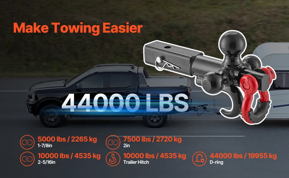 Anhängelast von bis zu 44.000 lbs/19.955 kg: Unsere Kugelkupplung ist aus hochbelastbarem Karbonstahl gefertigt, gewährleistet Sicherheit und Zuverlässigkeit beim Abschleppen und hält hohen Abschleppkräften stand. Nach professionellen Tests ist der D-Ring für eine Anhängelast von 44.000 lbs/19.955 kg ausgelegt, sodass Sie verschiedene Schwerlast-LKW oder Wohnmobile abschleppen können