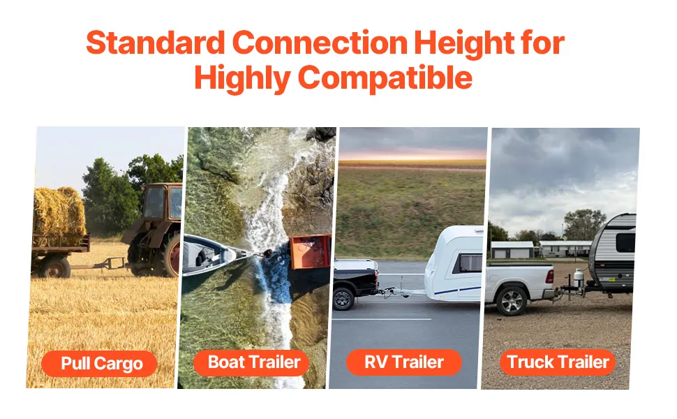 Standard-Anschlusshöhe: Nach dem Testen verschiedener Fahrzeuge haben wir eine Standard-Anschlusshöhe ausgewählt, die für die meisten Fahrzeughöhenanforderungen geeignet ist. Dieses Anhängerkupplungsdesign gewährleistet ein sanftes Ziehen, reduziert Stöße und Schwankungen und sorgt so für ein sichereres, komfortableres Fahrerlebnis, während es gleichzeitig den Verschleiß an Fahrzeug und Anhänger minimiert und deren Lebensdauer verlängert.