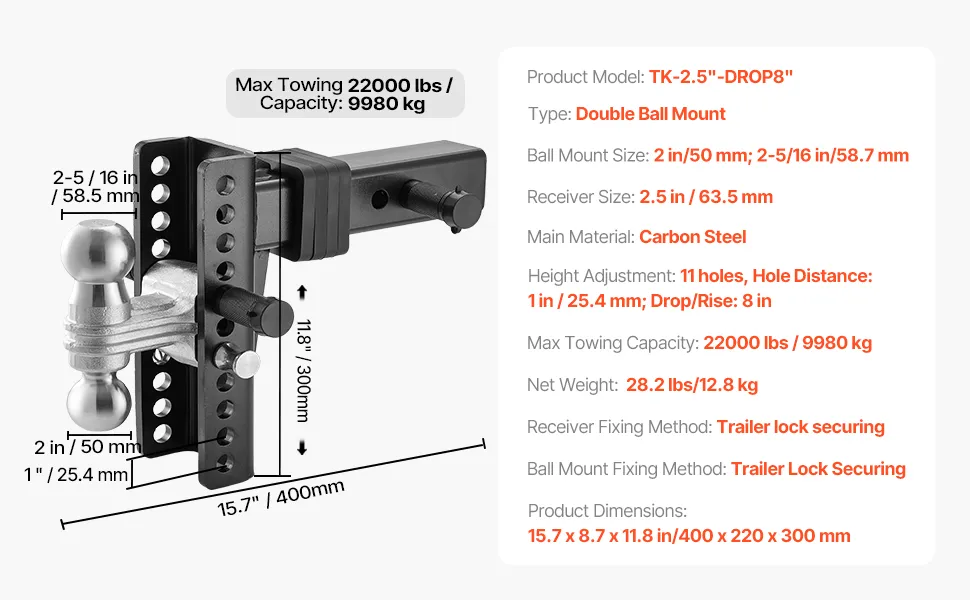 VEVOR verstellbare Anhängerkupplung, Kugelkopfhalterung, passend für 63,5 mm Empfänger, Doppelkupplung mit 50 mm und 58,7 mm Kugeln, 9980kg GTW, Empfängerkupplung mit Diebstahlschutzstift