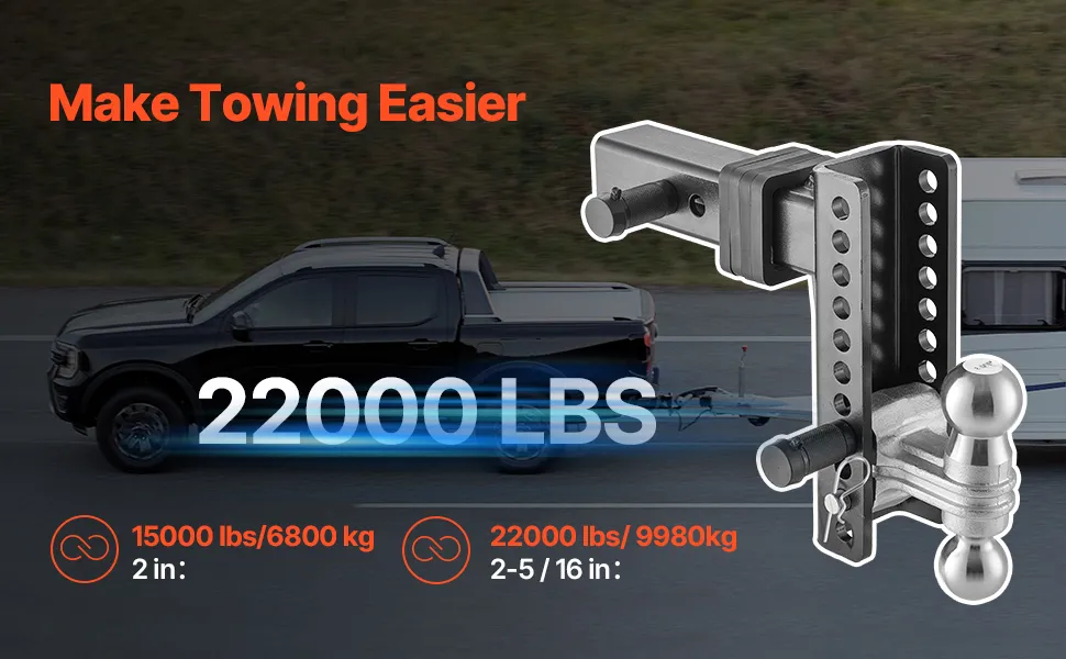 Unsere Kugelkupplung bietet eine leistungsstarke Anhängelast von 22.000 lbs / 9.980 kg und gewährleistet beim Abschleppen eine starke Zugkraft, während gleichzeitig die Sicherheit und Zuverlässigkeit während des gesamten Abschleppvorgangs gewährleistet bleiben.