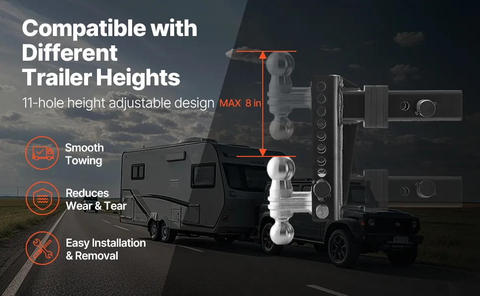 Einstellbare Verbindungshöhe: Die Anhängerkupplung lässt sich mit insgesamt 11 Löchern zur Höheneinstellung problemlos auf eine Absenktiefe von 8 Zoll/203 mm und eine Steighöhe von 8 Zoll/203 mm einstellen. Dadurch können Sie sich an unterschiedliche Fahrzeughöhenanforderungen anpassen und ein sanftes Abschleppen mit weniger Stößen und Schwanken gewährleisten, was zu einem sichereren und komfortableren Fahrerlebnis führt. Zudem wird dadurch der Verschleiß an Fahrzeug und Anhänger minimiert und deren Lebensdauer verlängert.