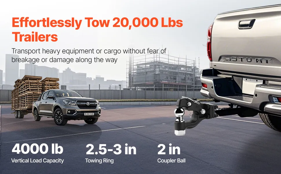 Hohe Tragfähigkeit: Unsere Bolzenkupplung unterstützt Anhängelasten von bis zu 20000 lbs / 9070 kg und hat eine vertikale Tragfähigkeit von 4000 lbs / 1814 kg. Sie verfügt über eine Kupplungskugelgröße von 2 Zoll / 50,8 mm und kann an 2,5- bis 3-Zoll / 63,5 bis 76,2 mm große Lünettenringe angeschlossen werden, was den Transport schwerer Geräte und Fracht erleichtert.