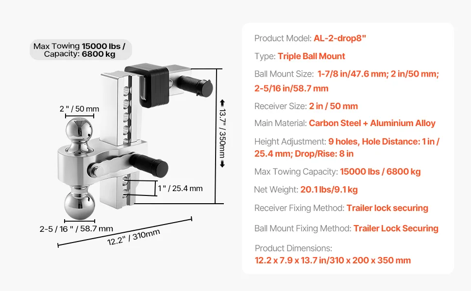 VEVOR Anhängerkupplung, 20,3 cm Kugelkupplung, Dreikugelhalterung für 5,08 cm Empfänger, Anhängerkugelgröße 47,6, 50,8 und 58,7 mm, max. 6800 kg, für Wohnmobile, Geländefahrzeuge und LKWs