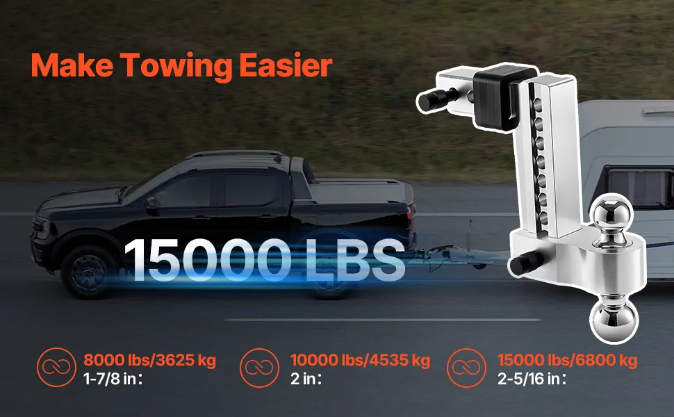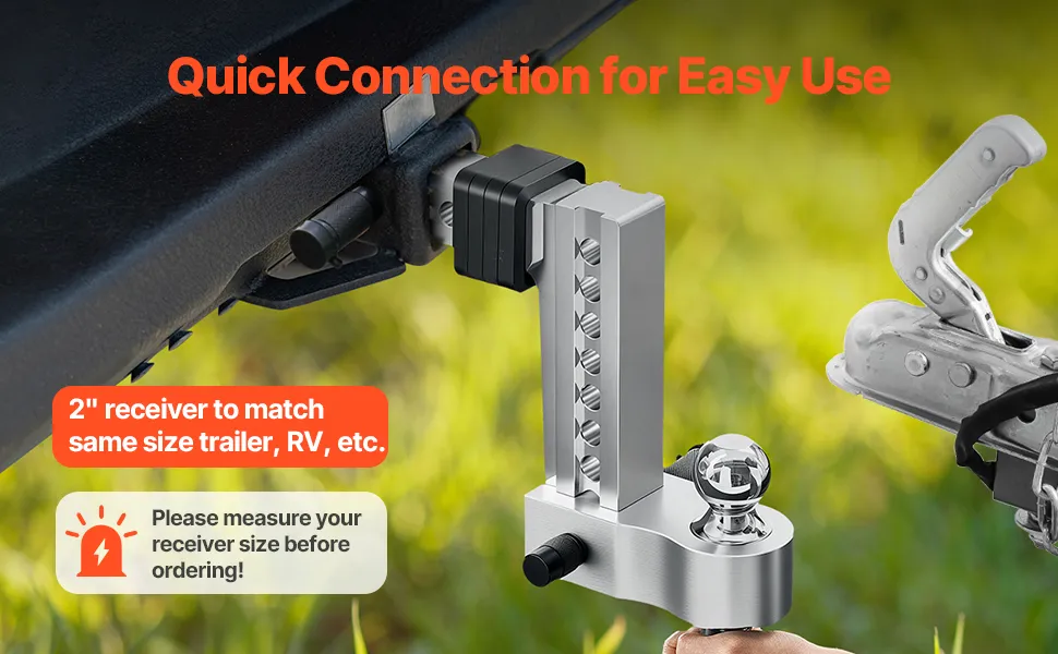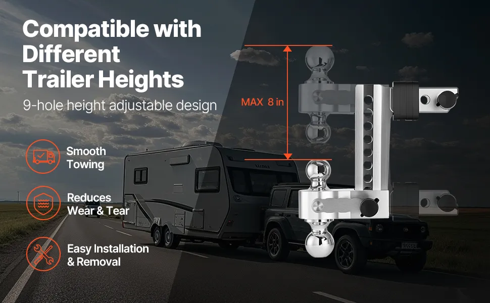 Die Anhängerkupplung erreicht schnell eine Absenktiefe von 8 Zoll/203 mm und eine Hubhöhe von 8 Zoll/203 mm mit 9 Einstelllöchern, sodass Sie die Verbindung an die erforderliche Höhe für verschiedene Fahrzeuge anpassen können.