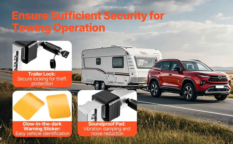 Das Anhängerschloss verriegelt die Ausrüstung sicher, verhindert ein versehentliches Lösen der Anhängerkupplung und dient gleichzeitig als Diebstahlschutz. Die Schallschutzmatte absorbiert Vibrationen und reduziert Geräusche. Der im Dunkeln leuchtende Warnaufkleber sorgt für Sicherheit bei nächtlichen Outdoor-Aktivitäten.