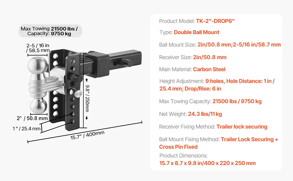 VEVOR verstellbare Anhängerkupplung, 152,4 mm Kugelkopfhalterung, Kugelkopf und Zugmaul, Anhängerkupplung mit 50,8 & 58,7 mm Kugeln, 9750 kg GTW, Doppel-Ball-Kupplung mit Diebstahlschutzstift
