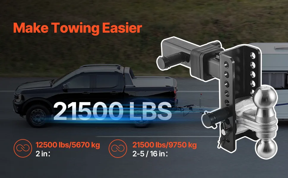 Unsere Anhängerkupplung mit Kugelkopf bietet eine leistungsstarke Anhängelast von 21.500 lbs (10.667 kg) und gewährleistet so eine starke Zugkraft beim Abschleppen, während die Sicherheit und Zuverlässigkeit während des gesamten Anhängerbetriebs gewährleistet bleiben.