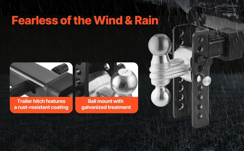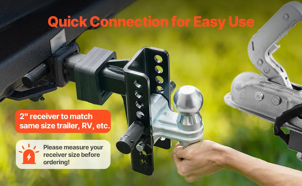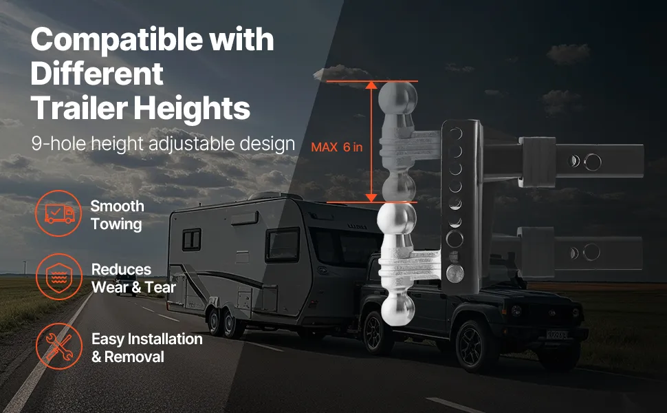 Die Anhängerkupplung erreicht mit 9 Einstelllöchern schnell eine Absenktiefe von 6 Zoll / 152,4 mm und eine Hubhöhe von 6 Zoll / 152,4 mm, sodass Sie die Verbindung an die erforderliche Höhe für verschiedene Fahrzeuge anpassen können.