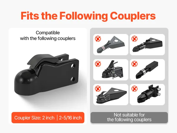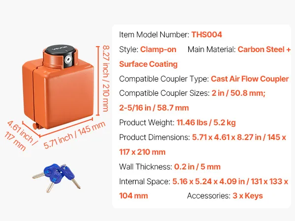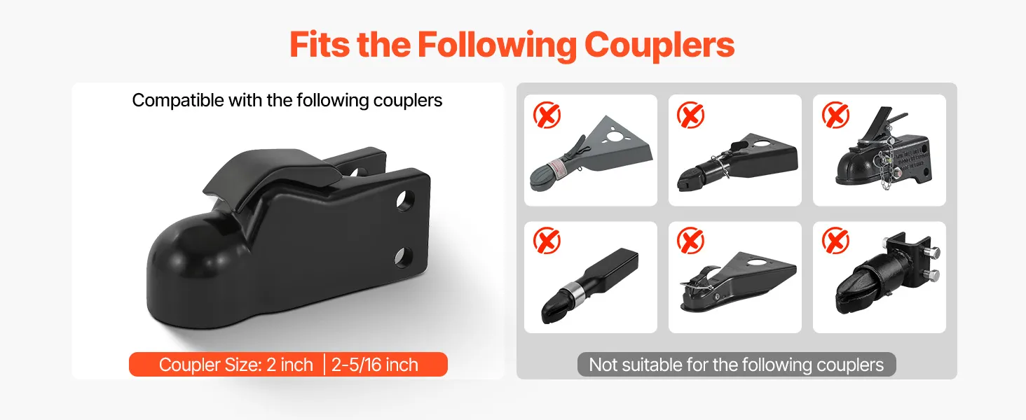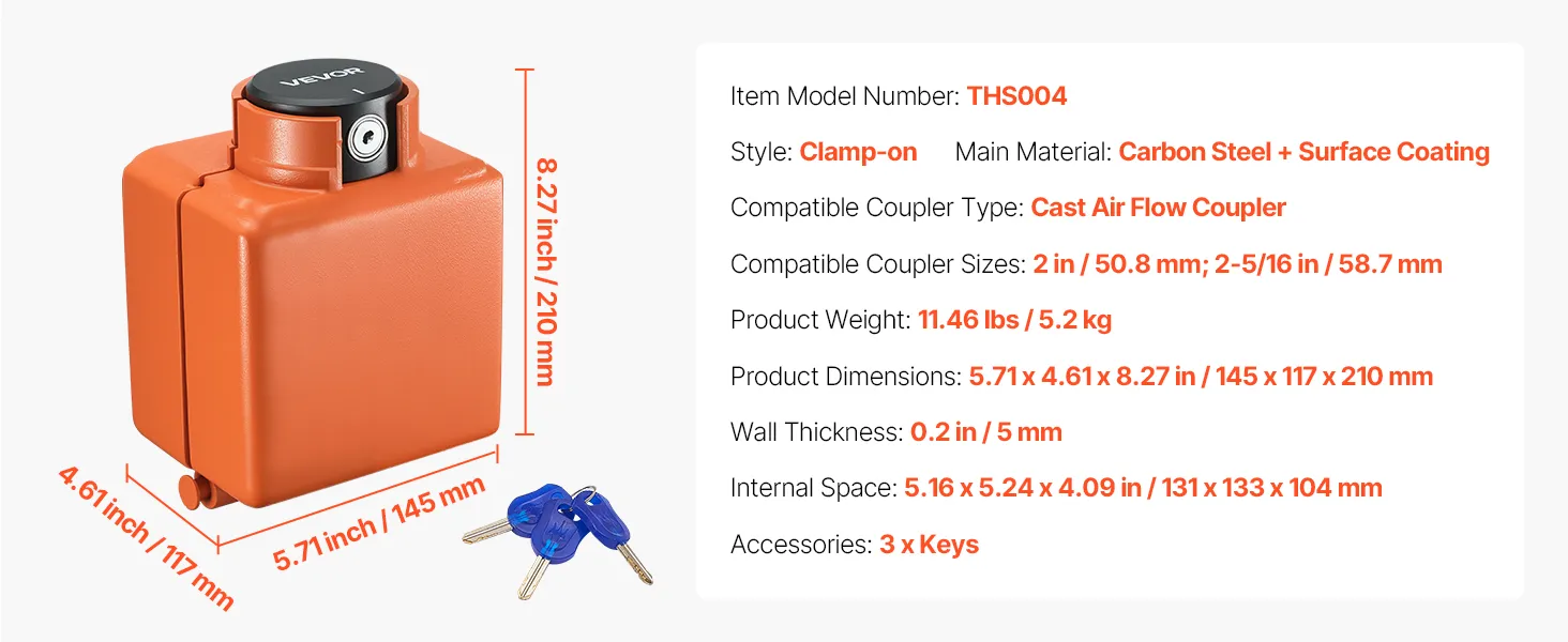 Dieses Anhängerschloss ist mit 50,8 mm und 58,7 mm Gussluftkupplungen kompatibel. Hinweis: Überprüfen Sie vor dem Kauf die Bilder, um sicherzustellen, dass es perfekt zu Ihrer Kupplung passt!