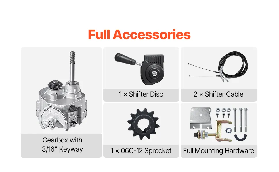 Das Gokart-Getriebekit enthält 1 x Getriebe, 1 x Kettenrad, 2 x Schaltzüge und andere notwendige Montageteile, die den Zusammenbau zu einem wunderbaren Erlebnis machen! Sie brauchen sich keine Sorgen zu machen, dass der Zusammenbau schwierig sein könnte.
