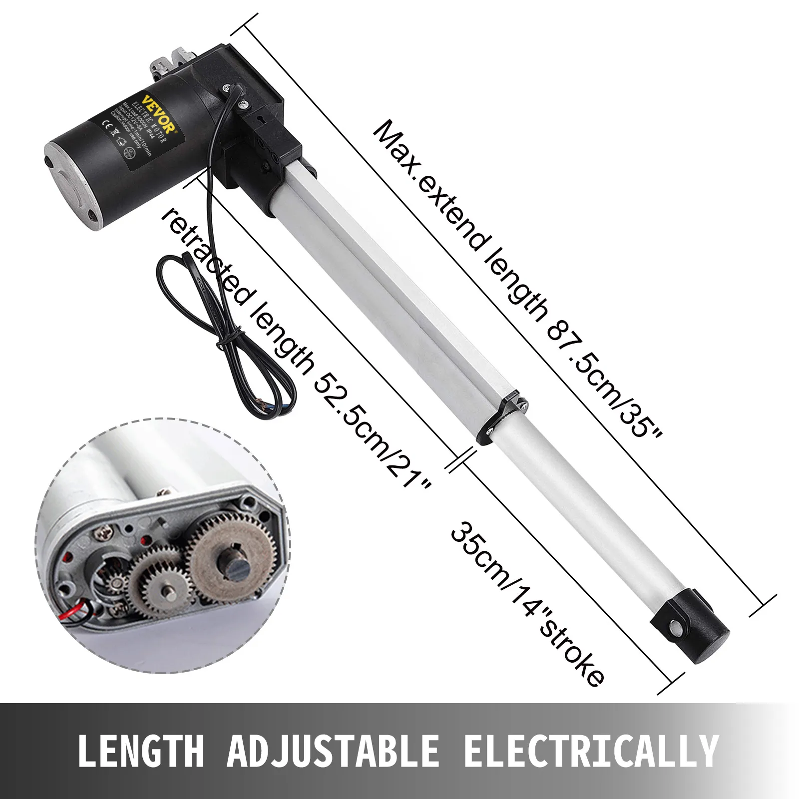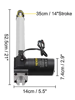 Dieser Aktuator unterstützt sowohl die Einfahr- als auch die Ausfahrbewegung des elektrischen Geräts.14 Zoll (ca. 36 cm) Hublänge, 20,6 Zoll (ca. 52 cm) eingefahrene Länge und 34,4 Zoll (ca. 87 cm) verlängerte Länge.