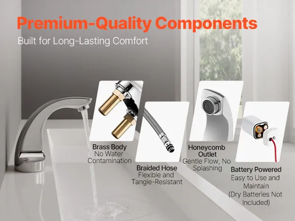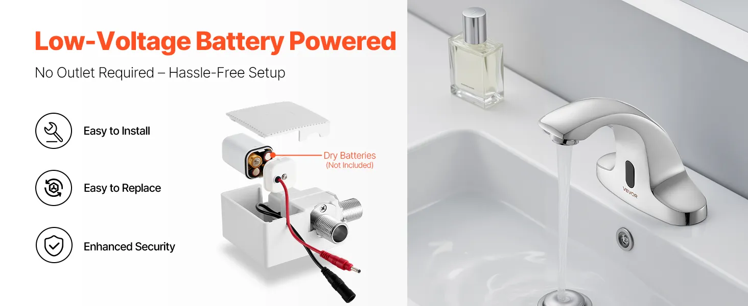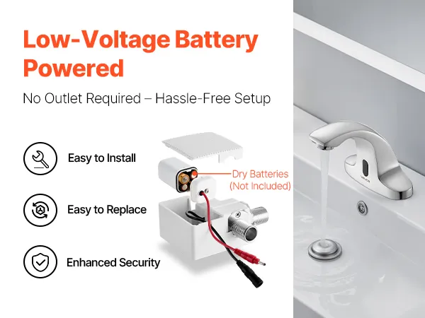 Diese Waschbeckenarmatur wird mit Niederspannungsbatterien betrieben und ist sicher und wartungsfreundlich. Es ist keine komplizierte Verkabelung oder externe Stromquelle erforderlich – einfach installieren und verwenden.