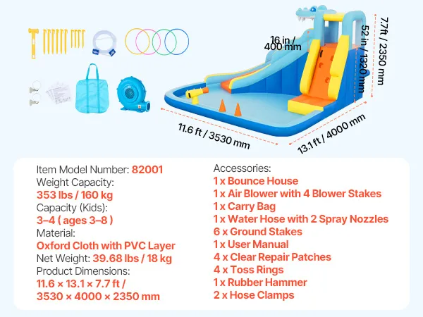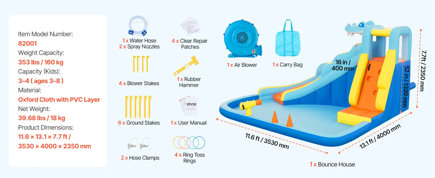 VEVOR Aufblasbare Wasserhüpfburg Outdoor (353 x 400 x 235 cm), Hüpfburg mit Wasserrutsche (Krokodil-Aussehen) & Kletterwand & Planschbecken & Wasserringwurfspiel, für 3–4 Kinder (3 bis 8 Jahre Alt)