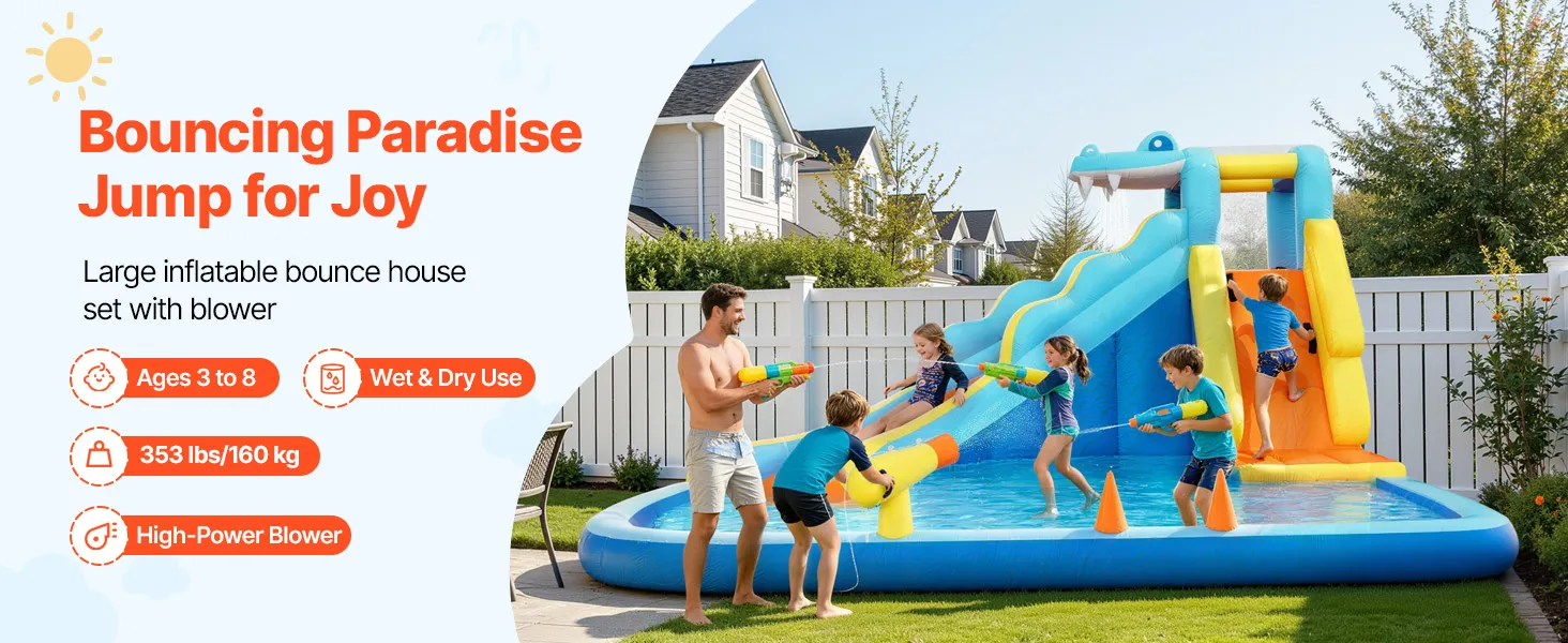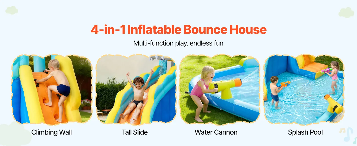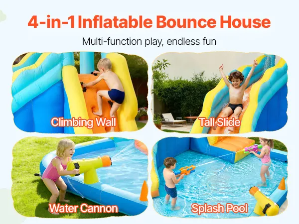 Mehr Spielmöglichkeiten: Mit einer hohen Rutsche, einer Wasserkanone und einem Planschbecken bietet diese aufblasbare Hüpfburg abwechslungsreichen Spaß für Kinder und Familien. Die Wasserkanone sorgt für einen gleichmäßigen Sprühnebel aus kühlem Wasser, hält Rutsche und Planschbecken stets spielbereit und schafft so ein fesselndes Erlebnis wie in einem aufblasbaren Wasserpark