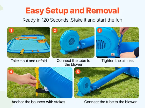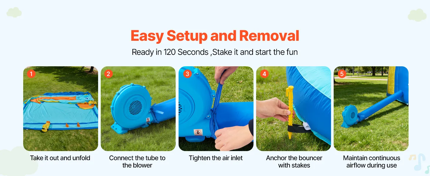 Leicht zu transportieren: Diese Hüpfburg wird mit einer Tragetasche mit Griffen geliefert. Auf- und Abbau sind kinderleicht, die Hüpfburg ist in weniger als zwei Minuten vollständig aufgeblasen. Die Befestigung der Schnallen, die den Luftauslass fixieren, ist im Lieferumfang enthalten. Bitte prüfen Sie den Boden vor dem Aufstellen auf scharfe Gegenstände