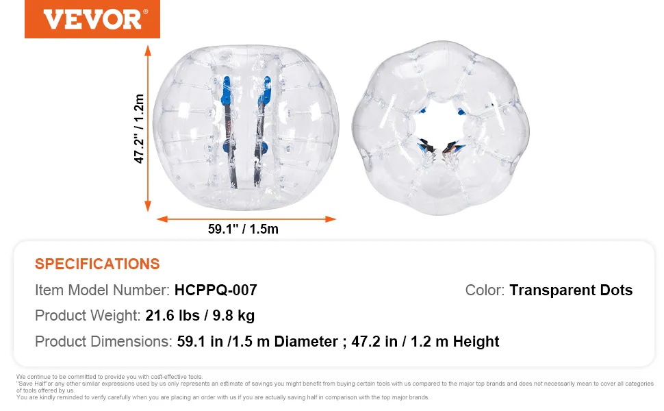 Der aufblasbare Bumper Ball von VEVOR ist aus hochwertigen Materialien gefertigt. Das 0,8 mm dicke explosionssichere PVC sorgt für Langlebigkeit. Er ist wasserdicht und weist eine hervorragende Reißfestigkeit auf. Fortschrittliche Ventilsysteme und eine dichte Abdichtung verhindern Luftlecks. Dies garantiert langanhaltende Unterhaltung. Ein ergonomisches Design sorgt für Komfort und Sicherheit. Verstellbare Schultergurte reduzieren den Druck. Diese halten die Spieler sicher im Inneren. Der Ball ist sowohl für Jugendliche als auch für Erwachsene perfekt geeignet. Sie können endlosen Spaß und Freude genießen.