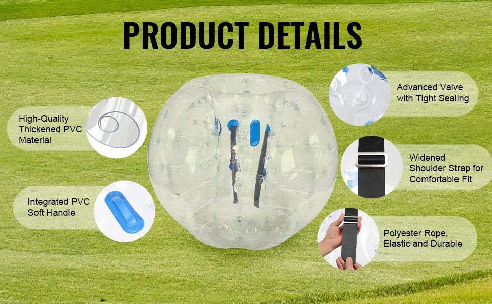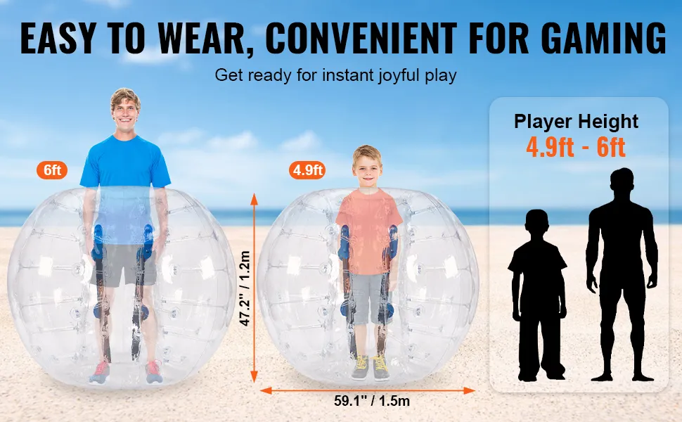Dieser Ball ist für Spieler mit einer Körpergröße von 1,5 bis 1,80 m konzipiert. Er kann Gewichte von 50 bis 150 kg tragen. Die integrierten PVC-Griffe sind ergonomisch gestaltet. Sie erhöhen die Sicherheit der Spieler. Verstellbare Schultergurte reduzieren den Druck auf die Schultern. So bleiben die Spieler sicher im Ball. Sie können diesen Ball sowohl für Teenager als auch für Erwachsene verwenden. Der aufblasbare Bumper Ball bietet eine sichere und spannende Aktivität für alle.