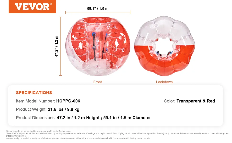 Der aufblasbare Bumper Ball von VEVOR hat einen Durchmesser von 1,52 m. Diese Größe ist perfekt für Jugendliche und Erwachsene. Er bietet den Benutzern genügend Bewegungsfreiheit. Der Ball ist auch für Kinder im Alter von 7 bis 14 Jahren sicher. Die Größe stellt sicher, dass Benutzer spielen können, ohne sich eingeschränkt zu fühlen. Außerdem ist es einfach, in den Ball hinein- und wieder herauszukommen. Er ist also für alle Benutzer bequem. Darüber hinaus trägt diese Größe dazu bei, dass die Bälle stabil sind und weniger leicht umkippen. Daher wird beim Spielen eine zusätzliche Sicherheitsebene geboten. Unsere ideale Größe macht diesen Bumper Ball zu einer fantastischen Wahl für Familienspaß.