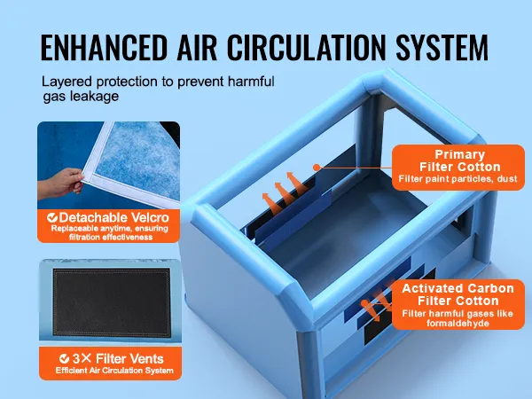 Effizientes Filtersystem: Unsere aufblasbare Lackierkabine verfügt über mehrere Filteröffnungen, darunter Primärfilter und Aktivkohlefilter, die Staub- und Schmutzpartikel effektiv zurückhalten und Gerüche und schädliche Gase beseitigen. Dies sorgt für eine angenehme Arbeitsumgebung und verhindert externe Kontamination.
