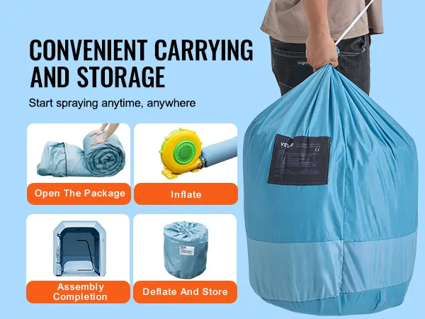 Die tragbare, aufblasbare Lackierkabine lässt sich einfach zusammenfalten und in der mitgelieferten Tragetasche verstauen. Sie bietet einen unvergleichlichen Komfort bei der Arbeit im Freien oder an wechselnden Orten.