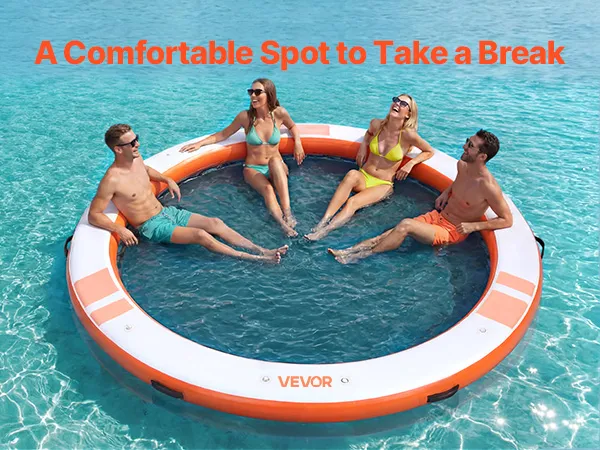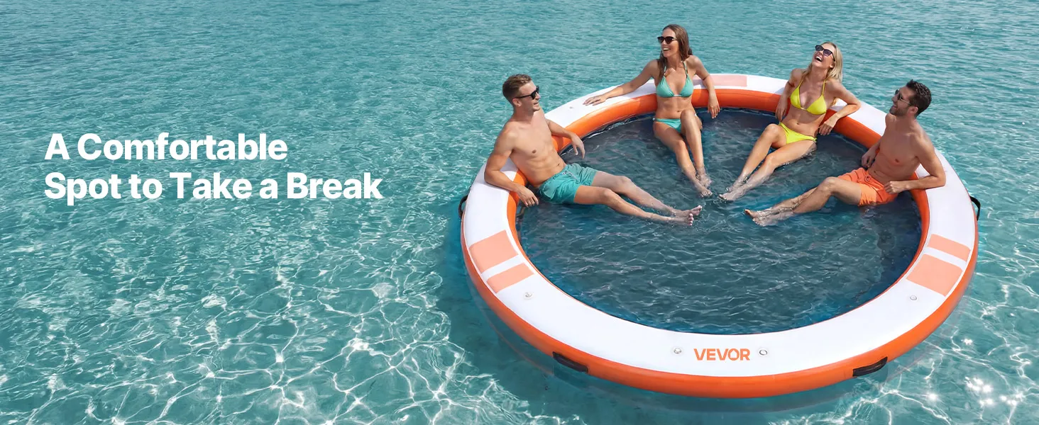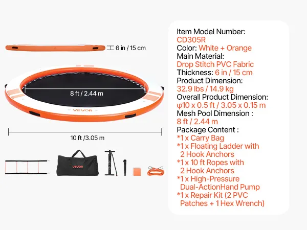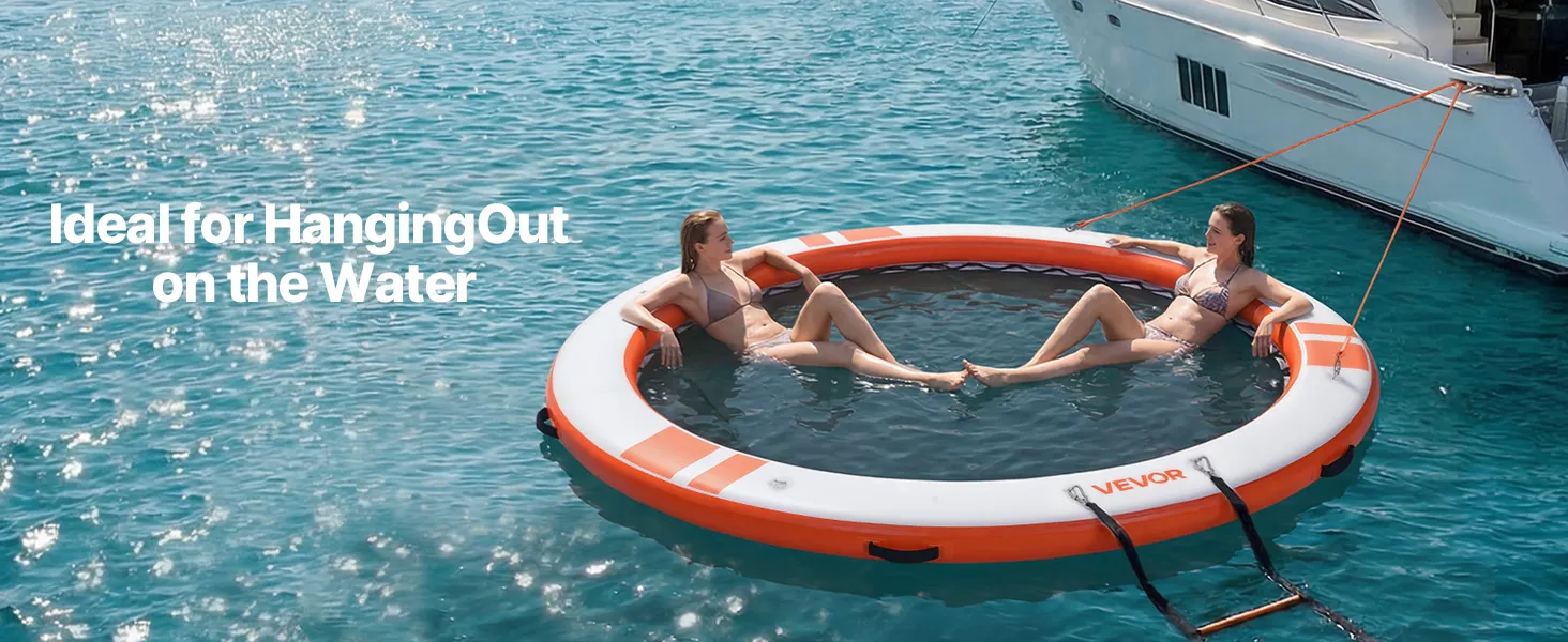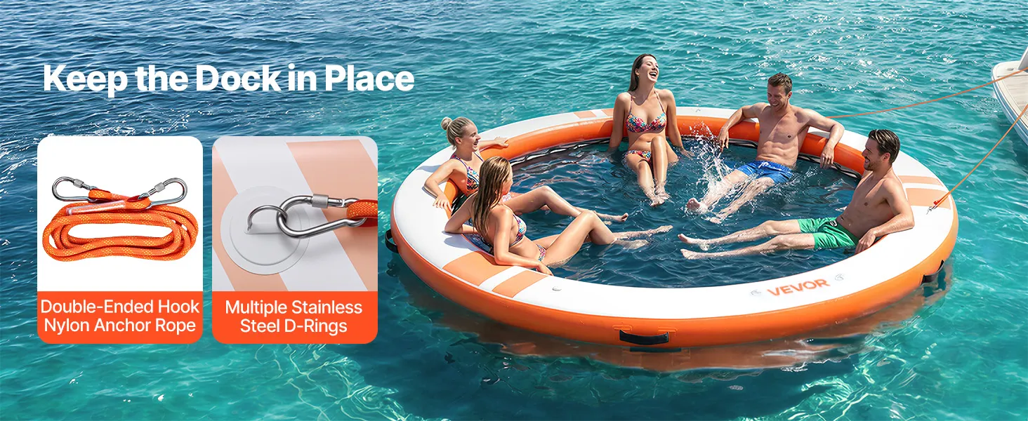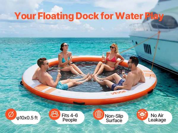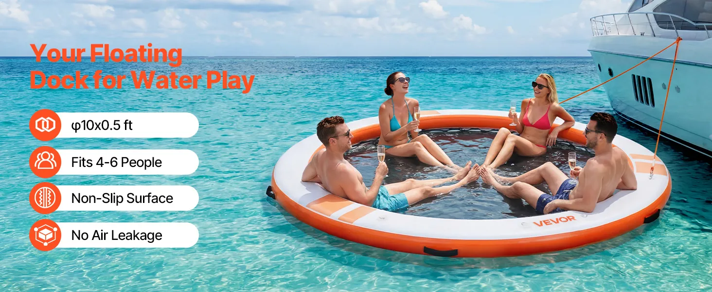 Das runde, aufblasbare Schwimmdock mit einem Durchmesser von 3,05 m (φ10 Fuß) bietet Platz für 4–6 Personen und trägt bis zu 499 kg (1100 lbs). Es eignet sich ideal als Badeplattform, Schwimmfloß oder Wasserlounge.