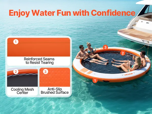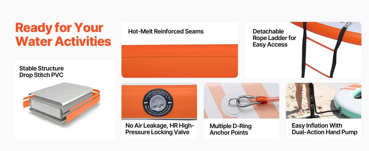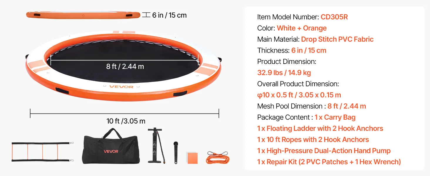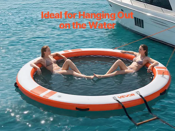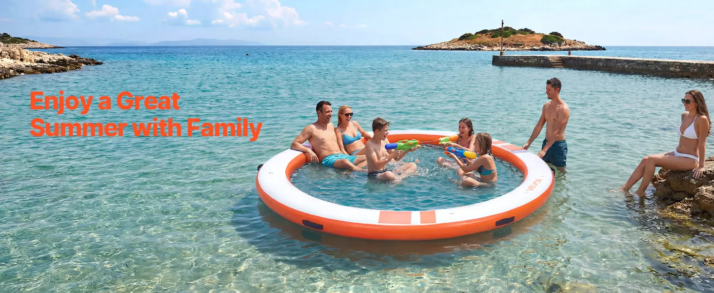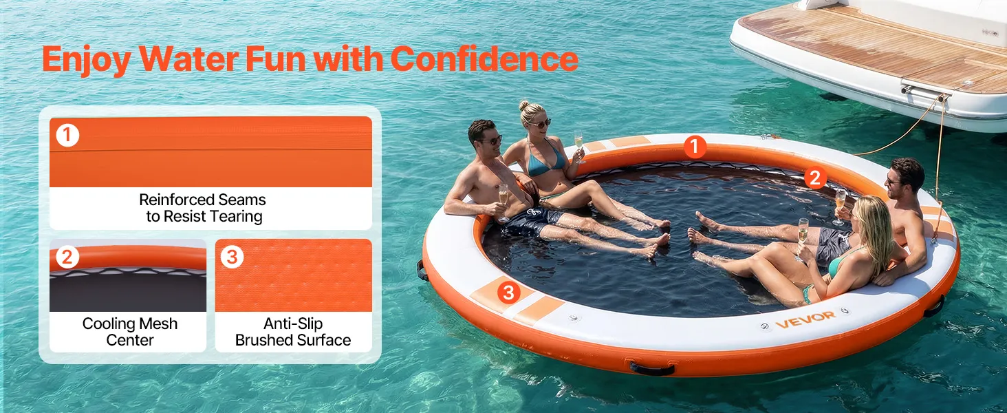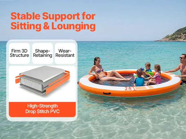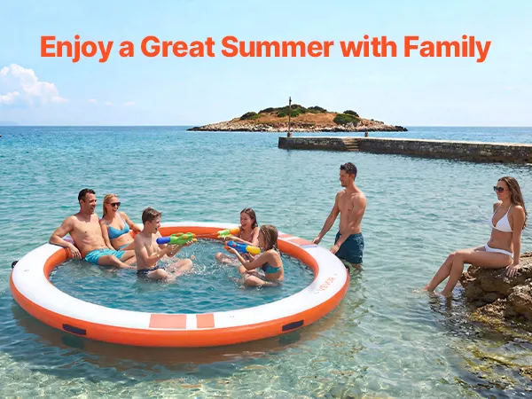Das runde, aufblasbare Schwimmdock mit einem Durchmesser von 3,05 m (φ10 Fuß) bietet Platz für 4–6 Personen und trägt bis zu 499 kg (1100 lbs). Es eignet sich ideal als Badeplattform, Schwimmfloß oder Wasserlounge.