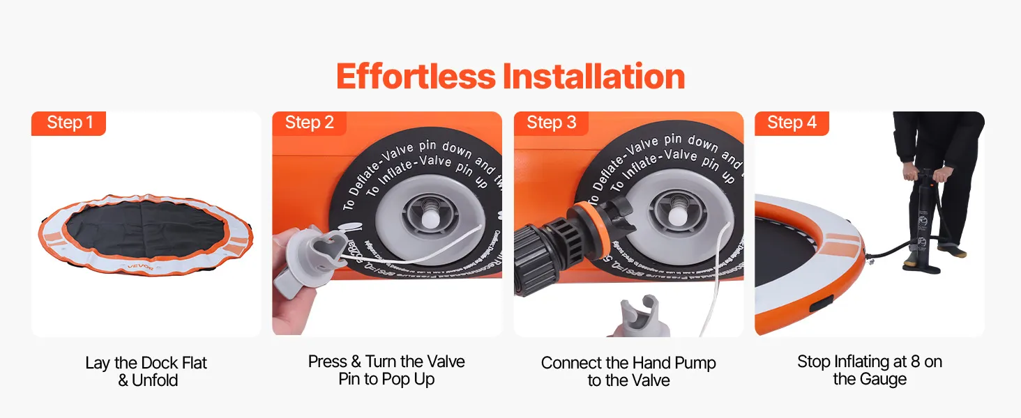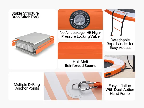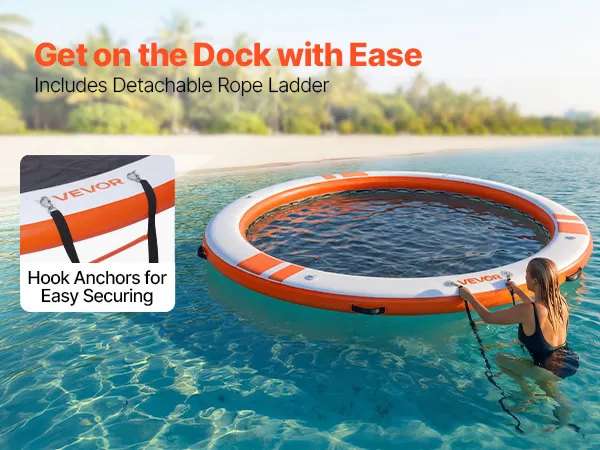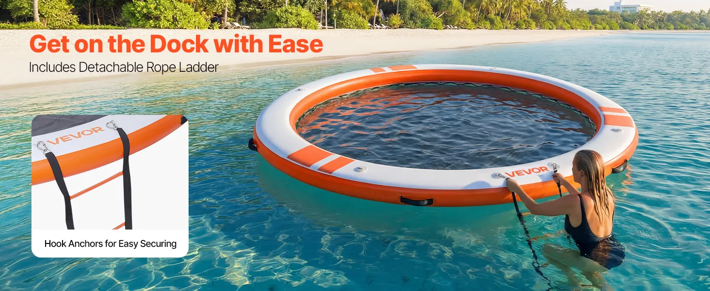 Geräumiges, aufblasbares Schwimmdock: Das aufblasbare Dock misst φ3,05 x 0,15 m (10 x 0,5 Fuß) und verfügt über ein 2,44 m (8 Fuß) großes, elastisches Netzbecken, das Platz für 4–6 Personen bietet. Die gebürstete Oberfläche sorgt für Rutschfestigkeit. Eine abnehmbare 4-stufige Strickleiter erleichtert den Ein- und Ausstieg