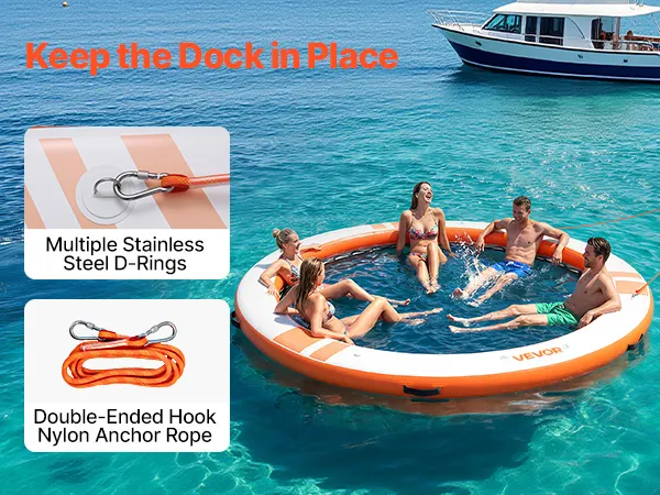 Einfache Verankerungsmöglichkeiten: Ausgestattet mit mehreren D-Ringen aus Edelstahl und Tragegriffen für flexible Befestigungspunkte. Unsere aufblasbare Dockplattform beinhaltet ein 3,05 m (10 Fuß) langes Nylonseil mit Hakenankern an beiden Enden zur bequemen Befestigung an Docks und Yachten