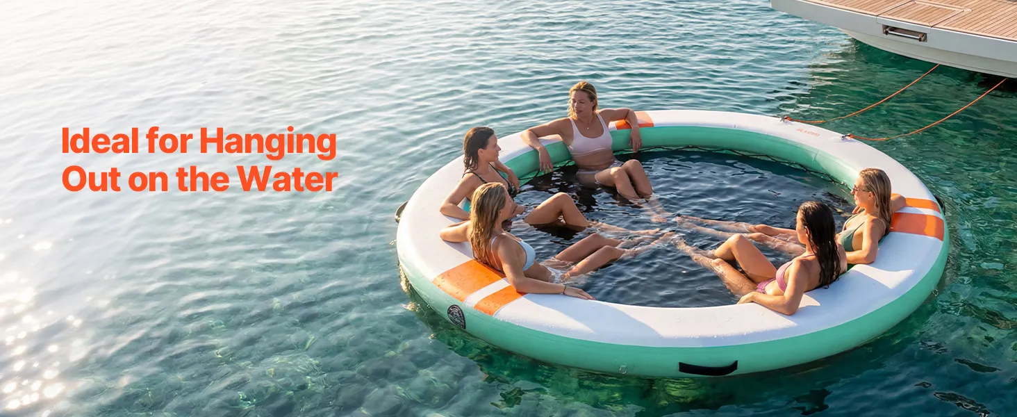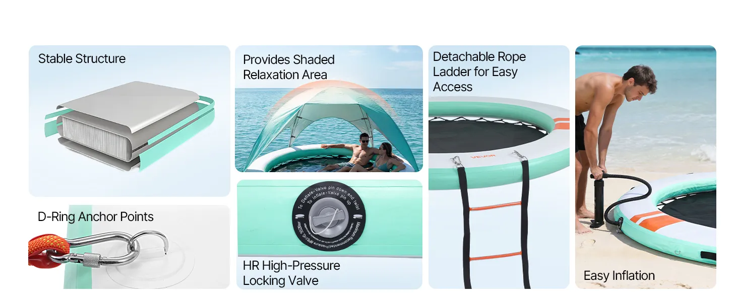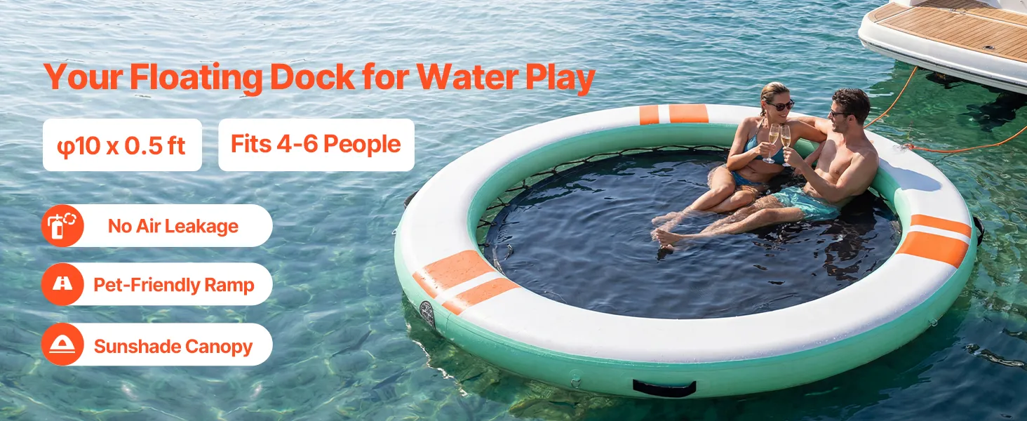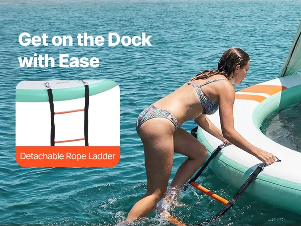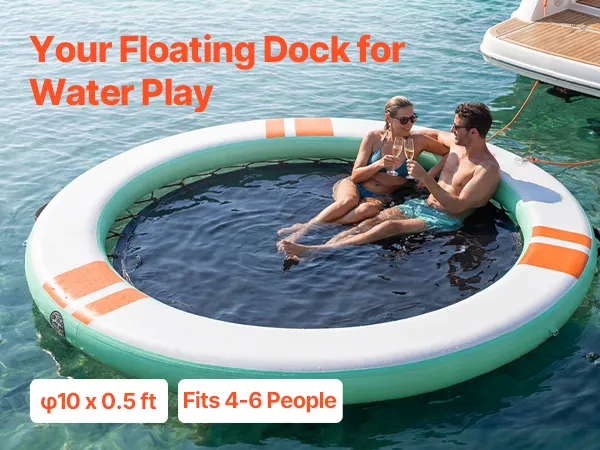 • Sonnenschutz auf dem Wasser: Unser aufblasbares Dock (Ø 3,05 m x 0,15 m / 10 x 0,5 Fuß) bietet Platz für 4–6 Personen. Das abnehmbare Sonnendach spendet Schatten und sorgt für einen kühlen Ruheplatz. Eine abnehmbare 4-stufige Strickleiter erleichtert das Ein- und Aussteigen