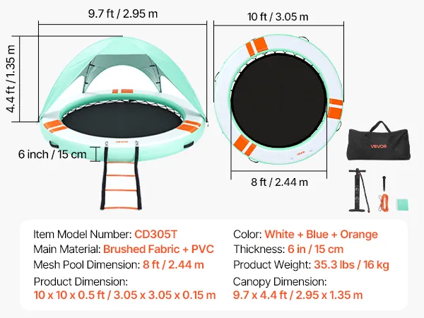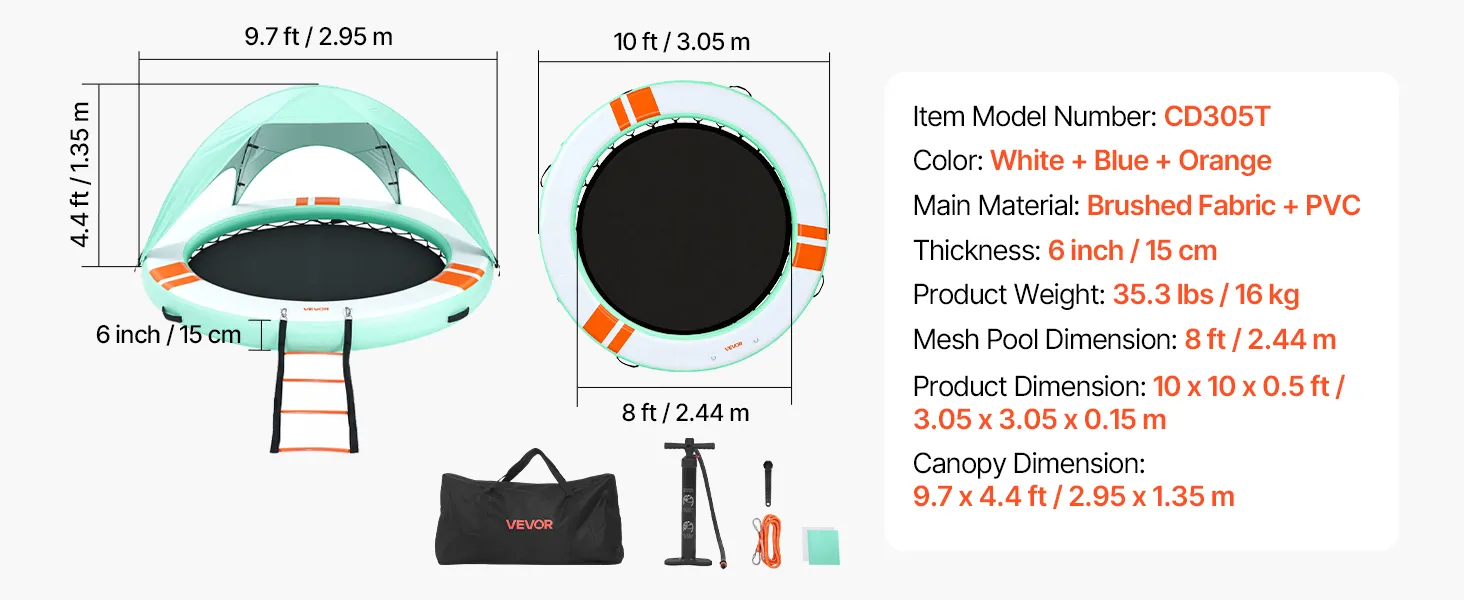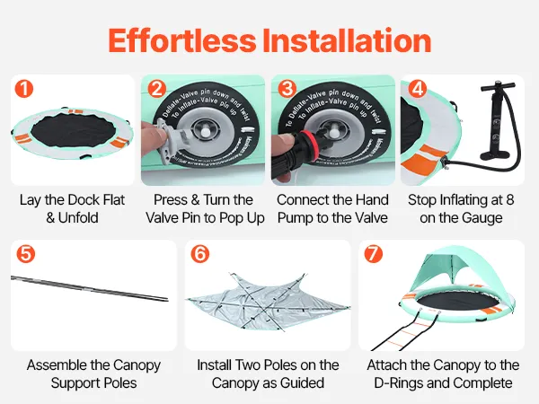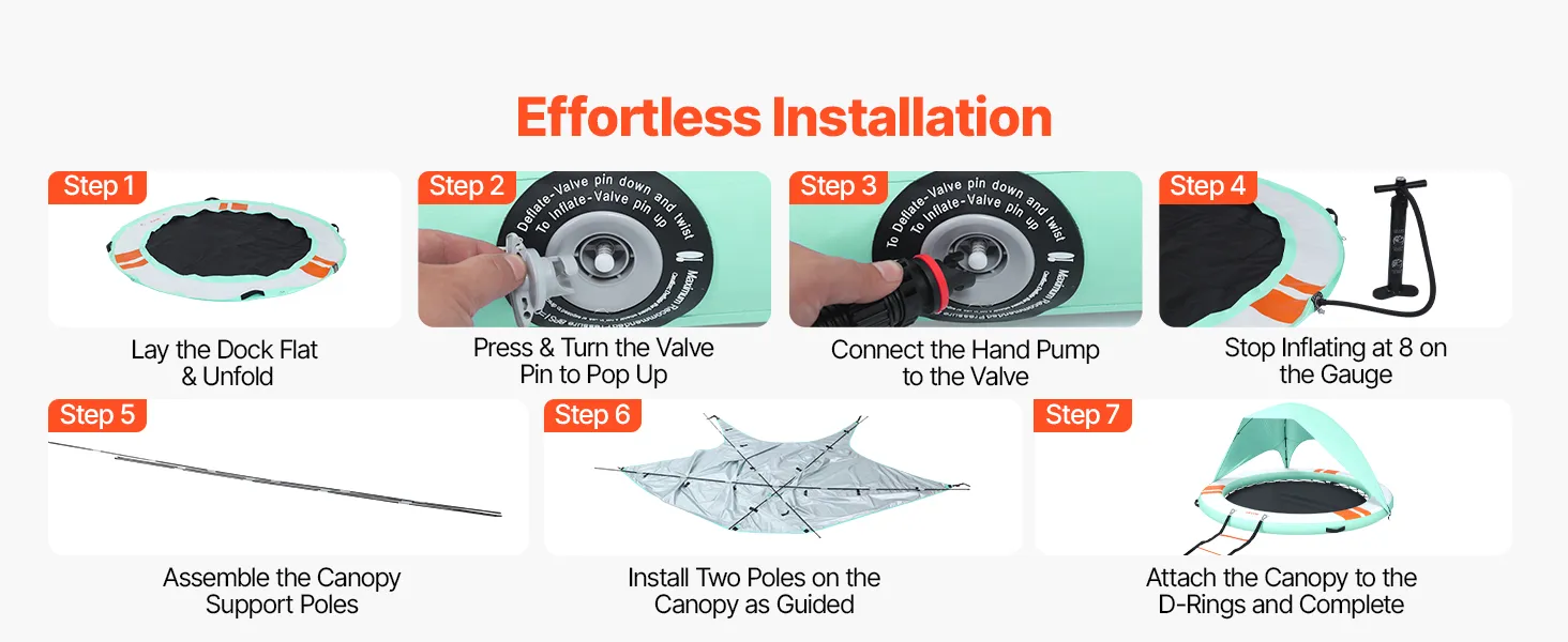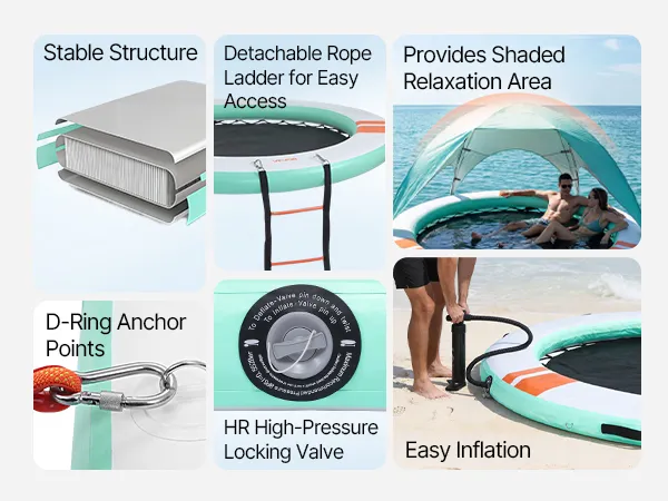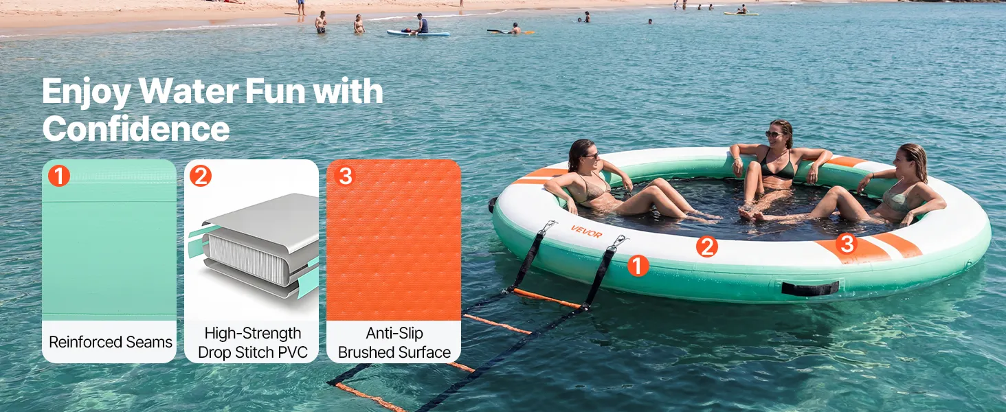 • Sonnenschutz auf dem Wasser: Unser aufblasbares Dock (Ø 3,05 m x 0,15 m / 10 x 0,5 Fuß) bietet Platz für 4–6 Personen. Das abnehmbare Sonnendach spendet Schatten und sorgt für einen kühlen Ruheplatz. Eine abnehmbare 4-stufige Strickleiter erleichtert das Ein- und Aussteigen