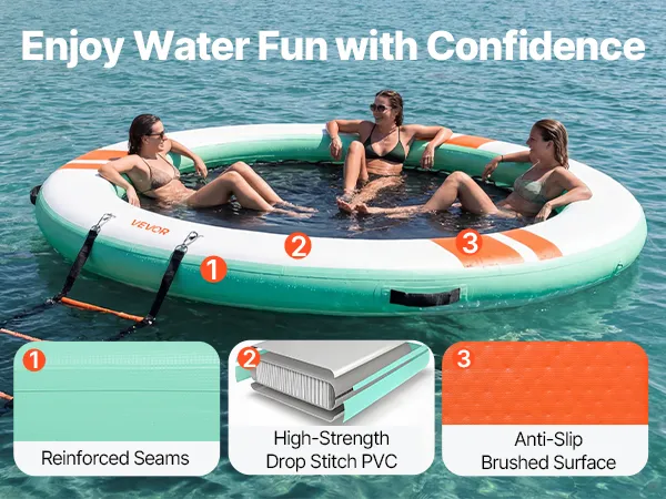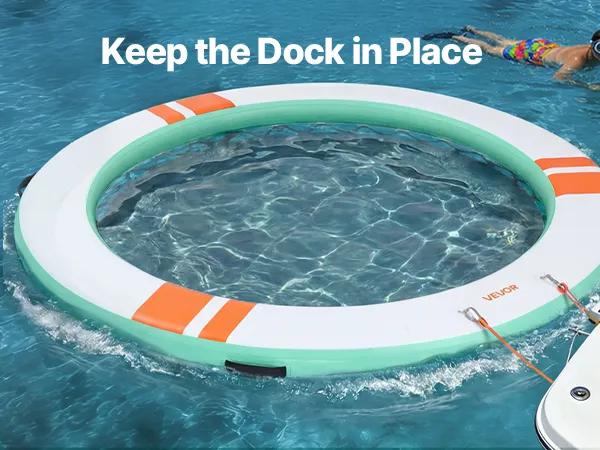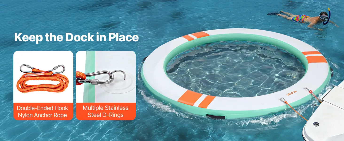 • Einfache Verankerungsmöglichkeiten: Ausgestattet mit mehreren D-Ringen aus Edelstahl und Tragegriffen für flexible Befestigungspunkte. Unsere aufblasbare Dockplattform beinhaltet ein 3,05 m (10 Fuß) langes Nylonseil mit Hakenankern an beiden Enden zur bequemen Befestigung an Docks und Yachten