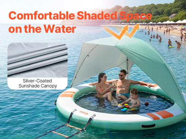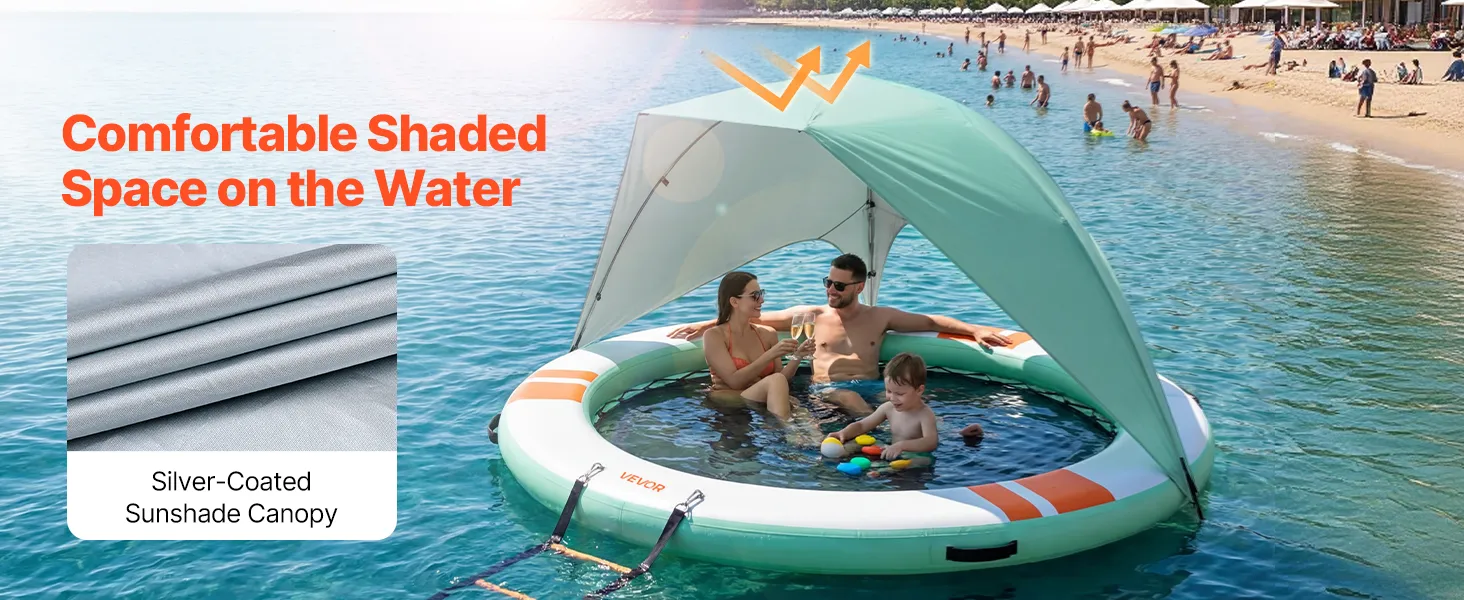 Dieses aufblasbare Schwimmdock mit Sonnenschutzdach bietet einen kühlen, schattigen Platz auf dem Wasser und schützt vor starker Sonneneinstrahlung. Es bietet Platz für 4–6 Personen und eignet sich ideal als Badeplattform, Schwimminsel oder Hängemattenbereich.