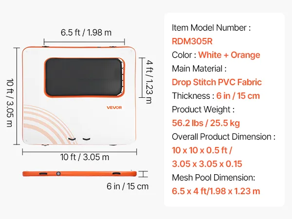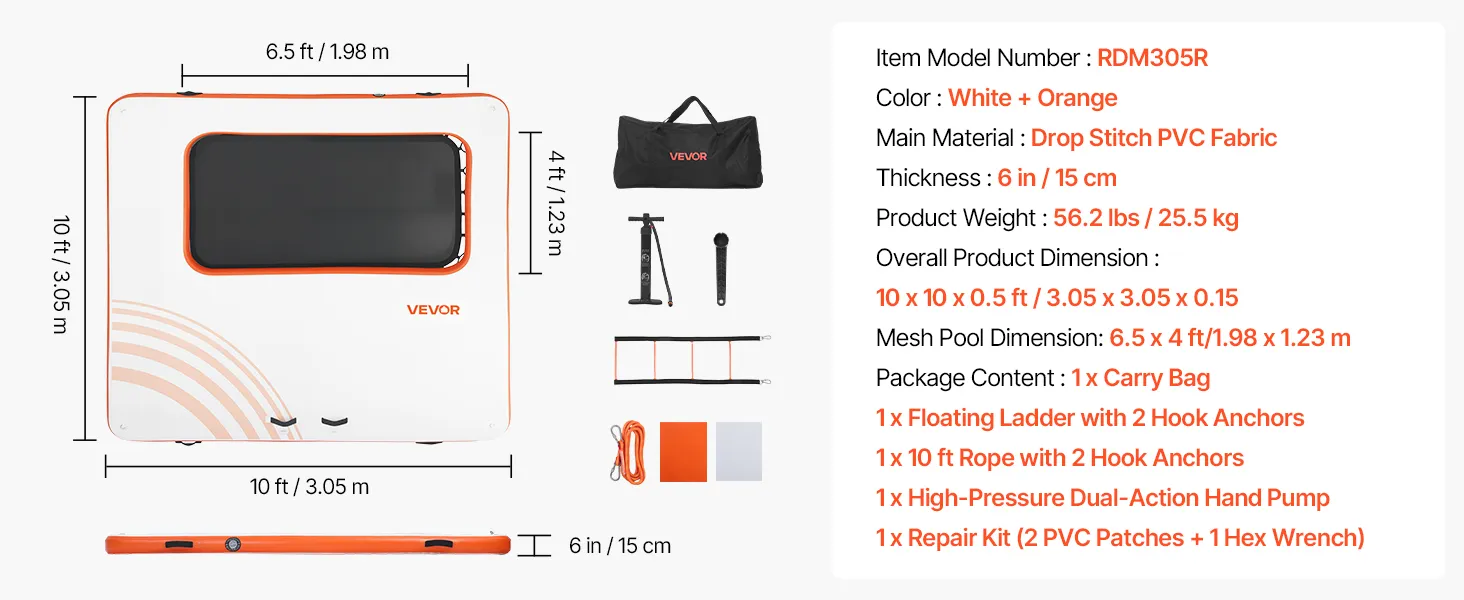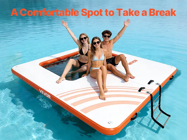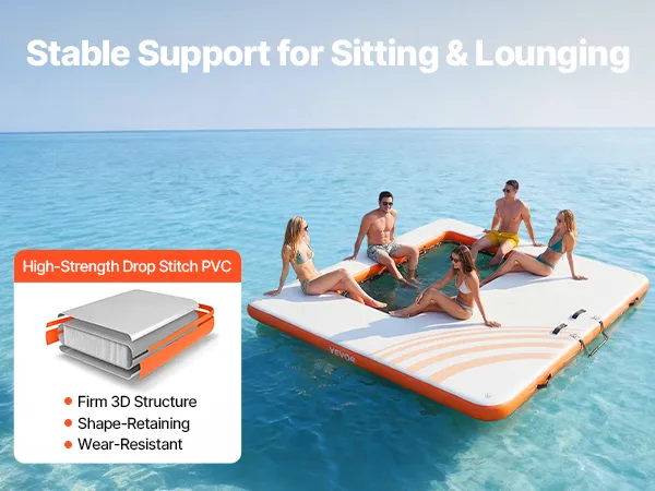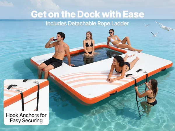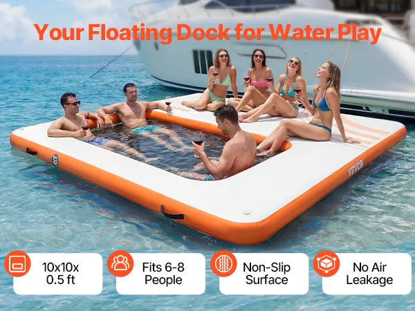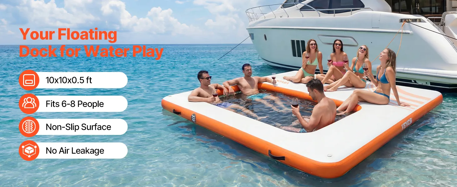 Geräumiges, aufblasbares Schwimmdock: Dieses aufblasbare Dock misst 3,05 x 3,05 x 0,15 m (10 x 10 x 0,5 Fuß) und verfügt über ein 1,98 x 1,23 m (6,5 x 4 Fuß) großes Netzbecken. Es bietet Platz für 6–8 Personen, die gebürstete Oberfläche sorgt für sicheren Halt und die abnehmbare 4-stufige Strickleiter erleichtert das Ein- und Aussteigen