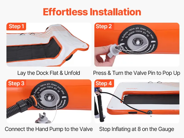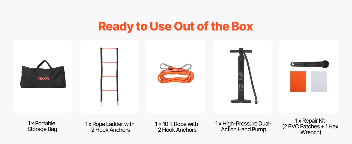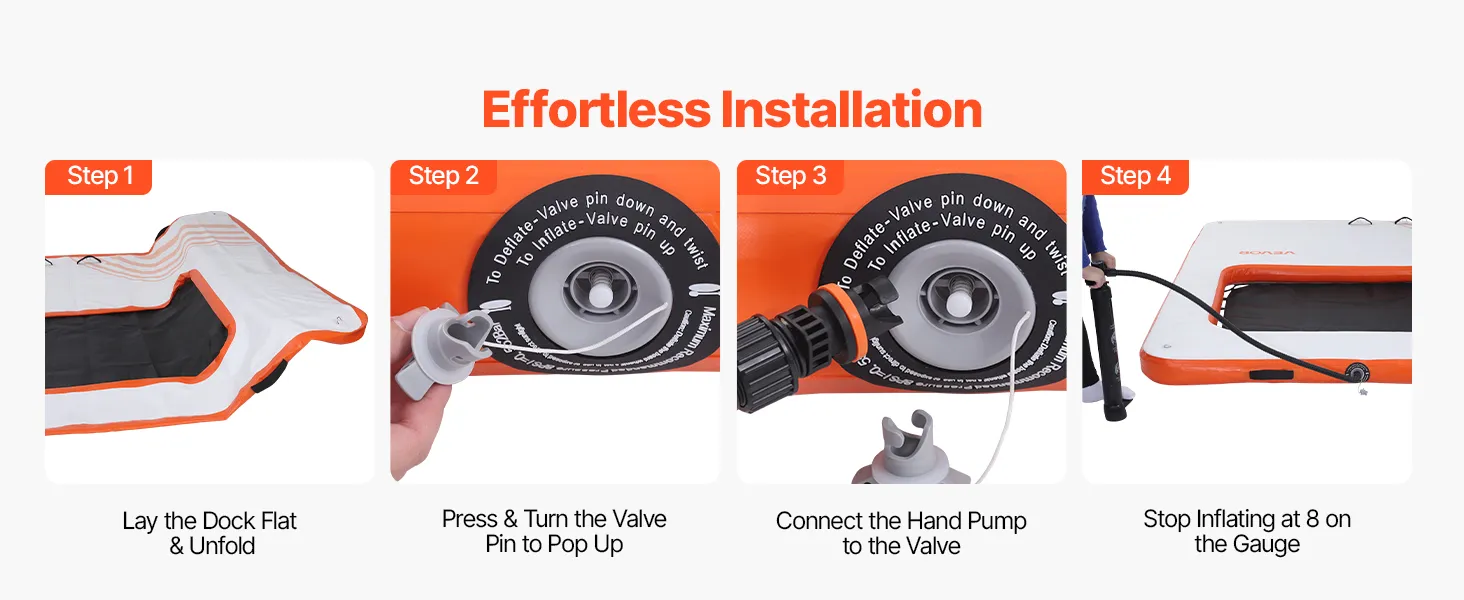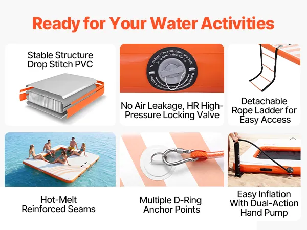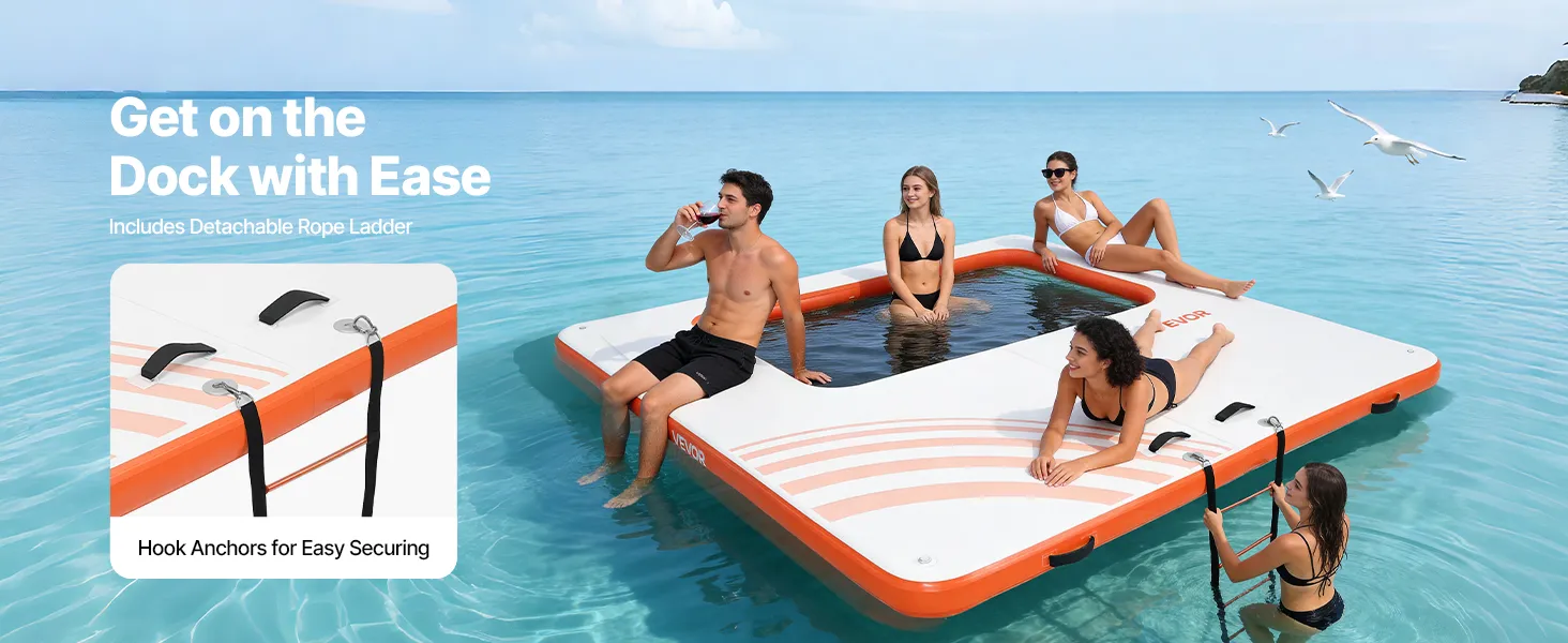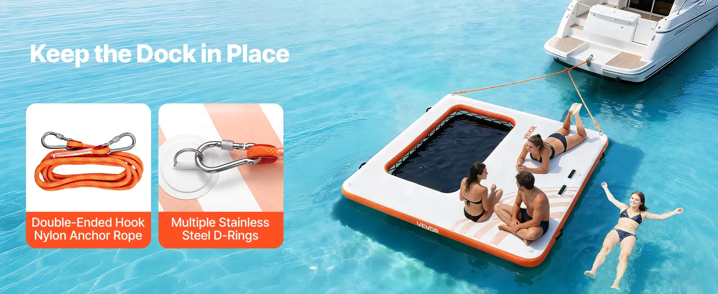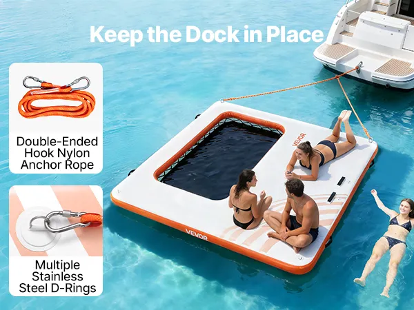 Einfache Verankerungsmöglichkeiten: Ausgestattet mit mehreren D-Ringen aus Edelstahl und Tragegriffen für flexible Befestigungspunkte. Unsere aufblasbare Dockplattform beinhaltet ein 3 m (10 Fuß) langes Nylonseil mit Hakenankern an beiden Enden zur bequemen Befestigung an Docks und Yachten