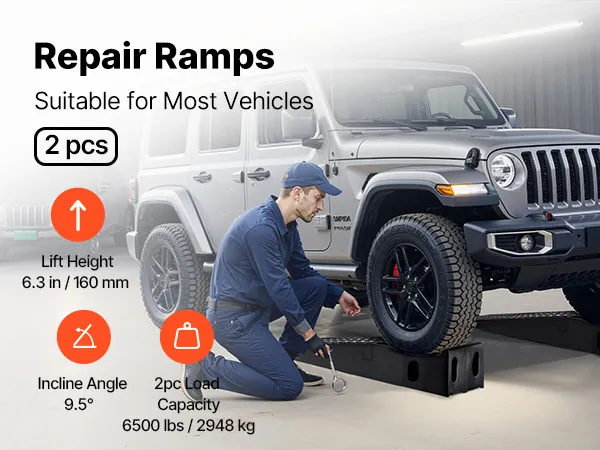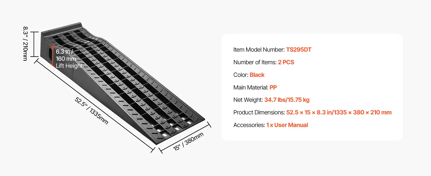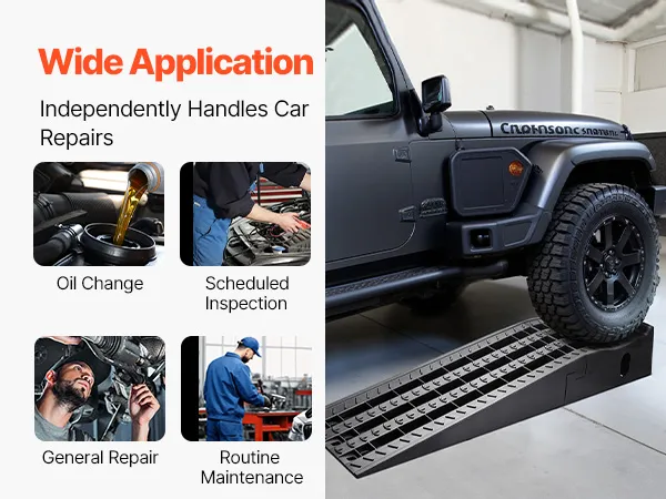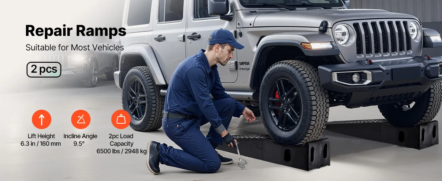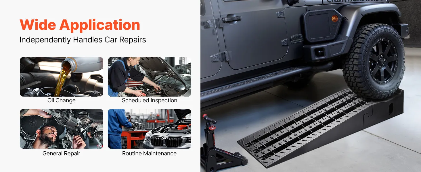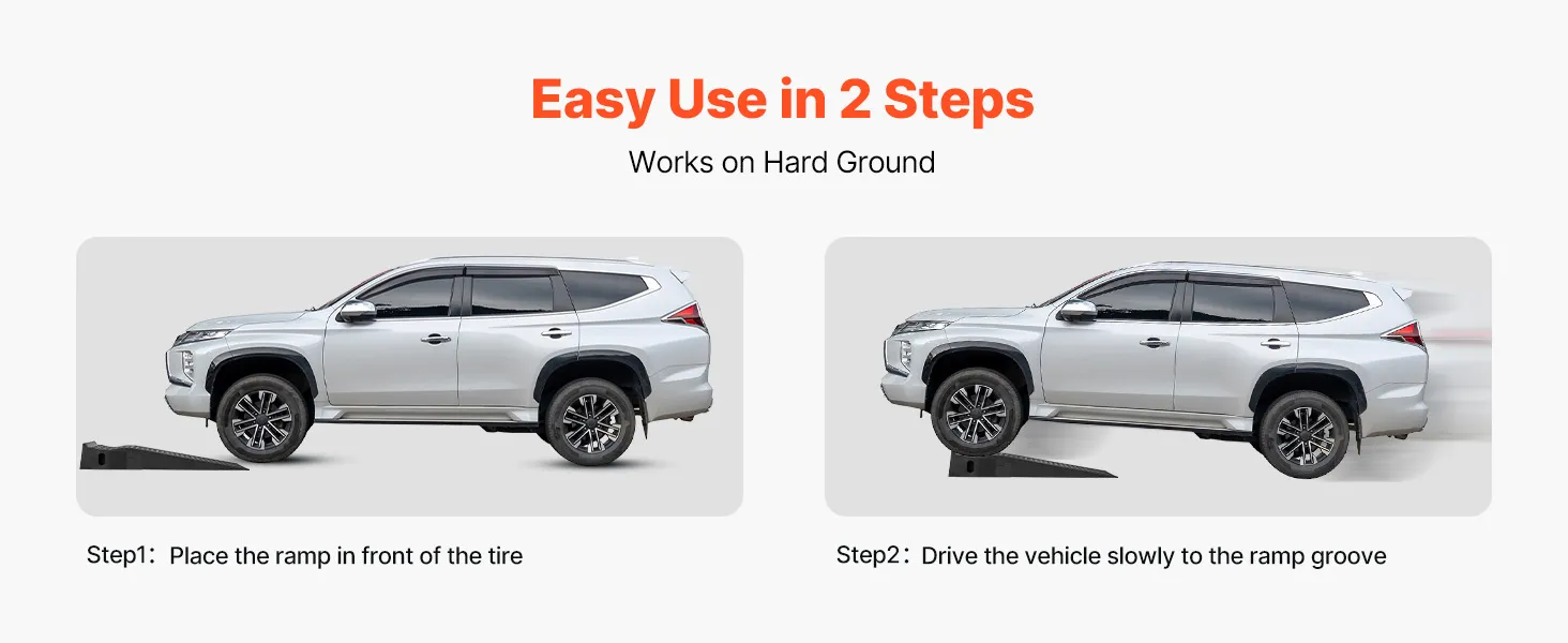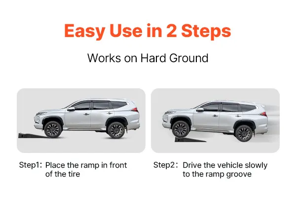 Extralange Rampe: Diese Hebebühnen sind 52,6 Zoll (1335 mm) lang, haben eine Hubhöhe von 6,3 Zoll (160 mm) und eine Neigung von 9,5°. Sie eignen sich für Fahrzeuge mit hohem Fahrgestell und funktionieren auch für einige Modelle mit niedrigem Fahrgestell, wodurch ein Kratzen des Unterbodens beim Anheben vermieden wird
