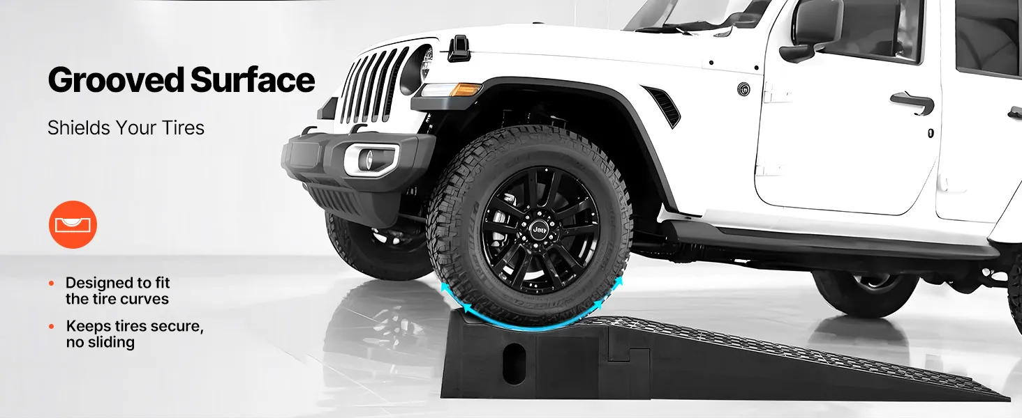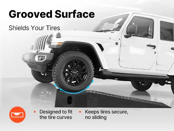 Die Oberfläche der Auffahrrampen verfügt über tiefe Rillen, die sich den Reifenkurven anpassen und die Reifen fest an ihrem Platz halten. Dieses Design minimiert das Rutschen und vermeidet Reifenschäden.