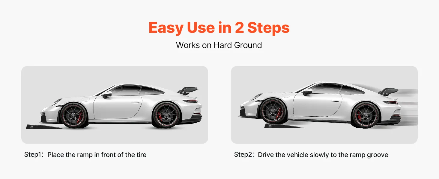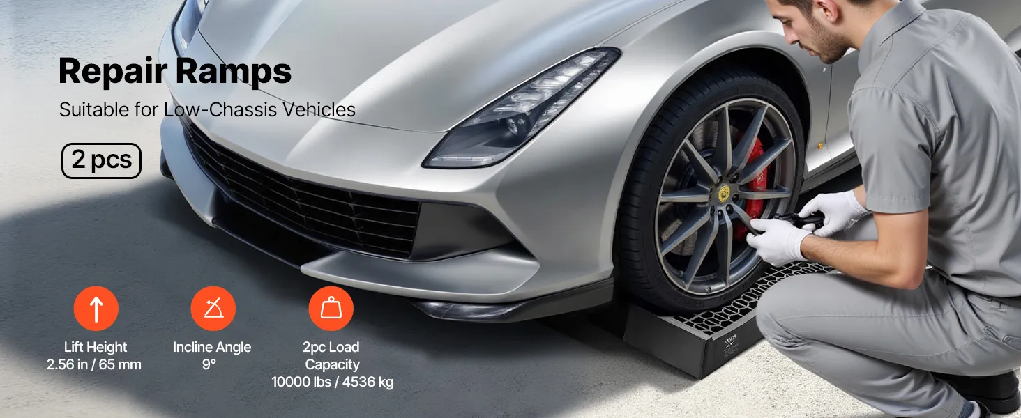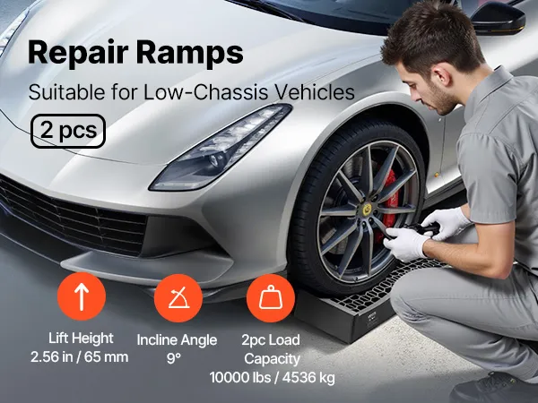 Passend für Fahrzeuge mit niedrigem Fahrgestell: Mit einer Hubhöhe von 2,56 Zoll (6,5 cm) und einer Neigung von 9° sind diese Hebebühnen ideal für Fahrzeuge mit niedrigem Fahrgestell und Sportwagen. Das 2er-Pack-Design eignet sich zum Anheben einzelner Räder und verhindert gleichzeitig das Kratzen des Unterbodens bei Reparaturen