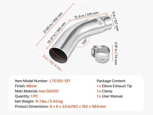 VEVOR Auspuffendrohr mit Winkelstück (127 mm Einlass,152 mm Auslass, 584 mm Gesamtlänge), nach unten gebogenes Auspuffendrohr mit Klemme für Lkw Limousine Sportwagen SUV, verchromte Oberfläche