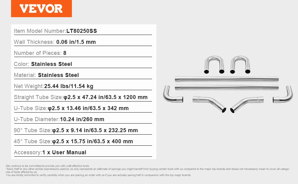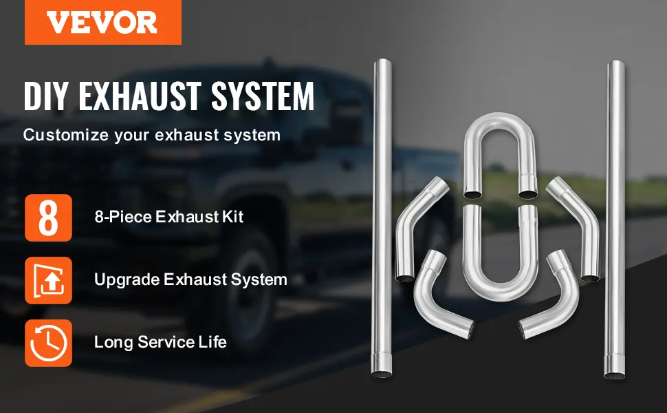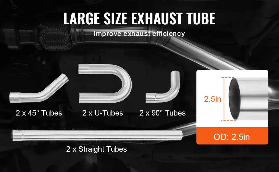 Komplettes Auspuff-Kit: Dieses Auspuff-Kit umfasst 8 Rohre mit einem Durchmesser von 2,5 Zoll (63,5 mm), darunter 2 gerade Rohre, 2 90°-Rohre, 2 45°-Rohre und 2 U-förmige Rohre zur vollständigen individuellen Gestaltung.