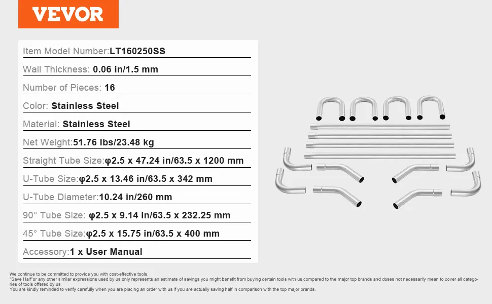 Komplettes Auspuffset: Dieses Auspuffset umfasst insgesamt 16 Rohre mit einem Durchmesser von 2,5 Zoll (6,35 cm), darunter 4 gerade Rohre, 4 90°-Rohre, 4 45°-Rohre und 4 U-förmige Rohre. Dieses Set bietet Ihnen die Flexibilität, Ihr Auspuffsystem für maximale Effizienz vollständig anzupassen.