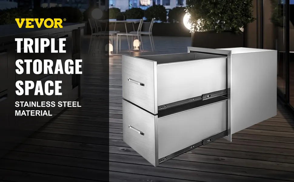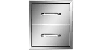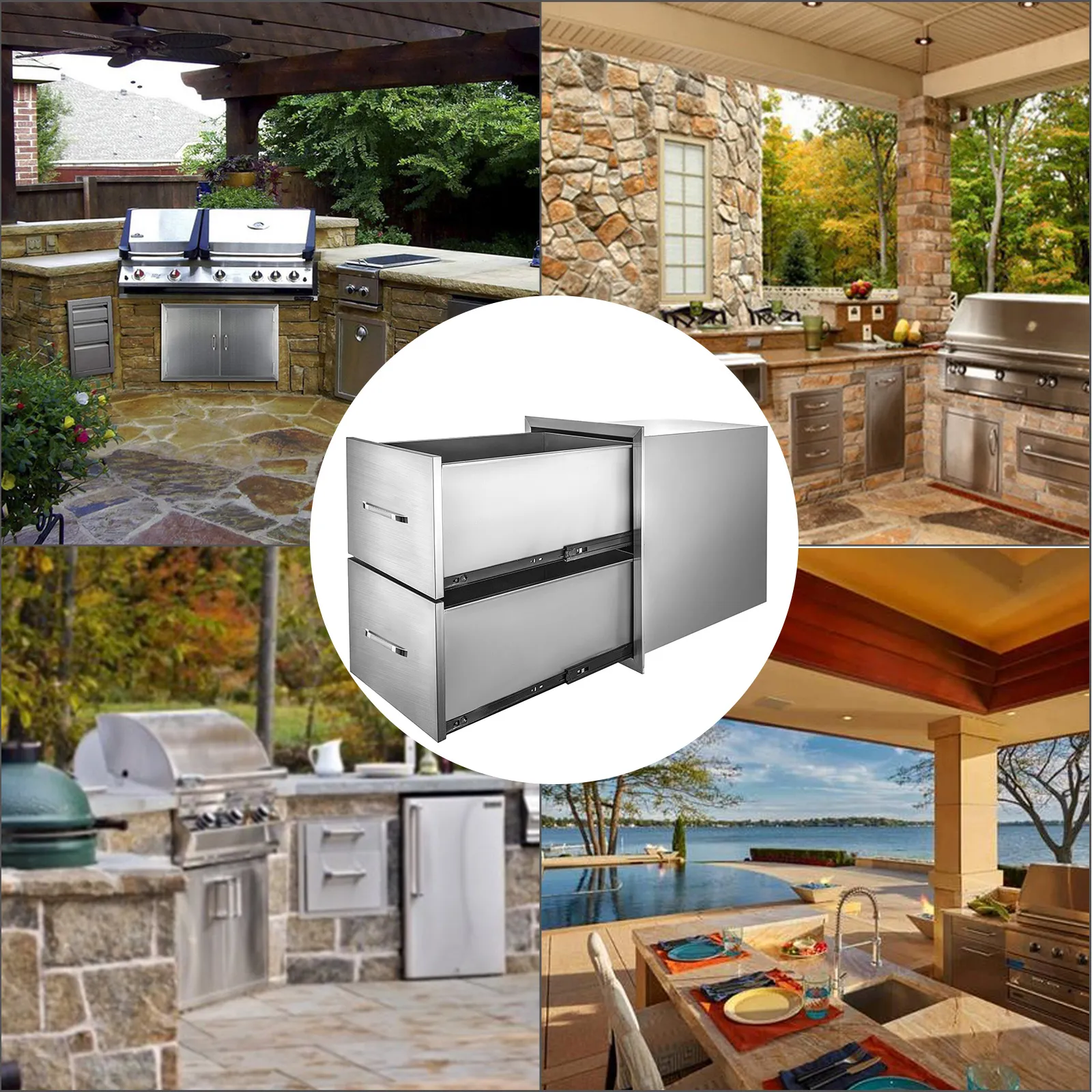 Hochwertige Küchenschubladen im Freien mit doppeltem Stauraum, die einen großen Stauraum für Küchenutensilien gewährleisten. Es besteht aus Edelstahl und ist langlebig und robust für den Langzeitgebrauch. Auch korrosionsbeständig und leicht zu reinigen. Mit dem vollständig geschlossenen Kasten können die Innenseiten wirksam vor Regen, Wind, Staub und Insekten geschützt werden. Es ist perfekt für die Küche im Freien und den Grill mit Inselstil.