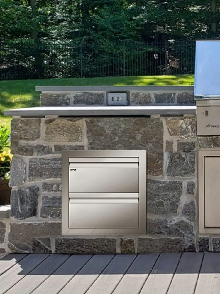 Hochwertige Küchenschubladen im Freien mit doppeltem Stauraum, die einen großen Stauraum für Küchenutensilien gewährleisten. Es besteht aus Edelstahl und ist langlebig und robust für den Langzeitgebrauch. Auch korrosionsbeständig und leicht zu reinigen. Mit dem vollständig geschlossenen Kasten können die Innenseiten wirksam vor Regen, Wind, Staub und Insekten geschützt werden. Es ist perfekt für die Küche im Freien und den Grill mit Inselstil.