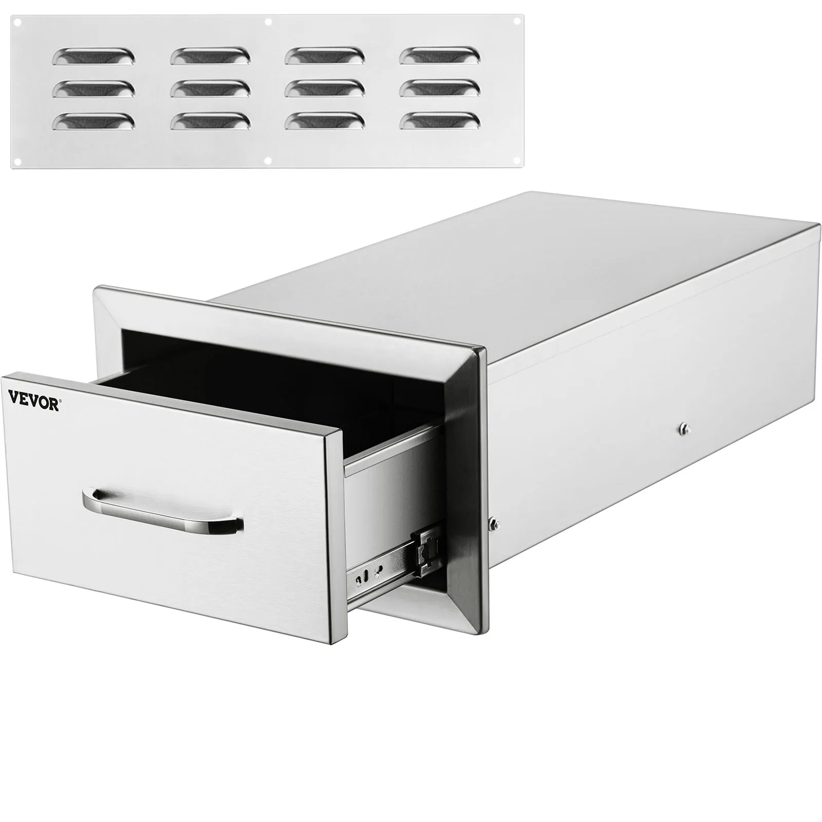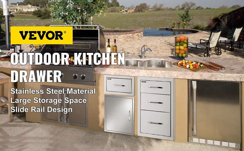 Diese Aufbewahrungsschubladen für den Außenbereich sind äußerst vielseitig. Sie können für Außenküchen, insbesondere Grillinseln, verwendet werden und Sie können die meisten Küchenutensilien darin aufbewahren. Und sie können auch im Innenbereich verwendet werden. Die Edelstahlkonstruktion sorgt für Haltbarkeit bei jedem Wetter. Egal, ob es windig oder regnerisch ist; diese Küchenaufbewahrungsschubladen bleiben intakt. Das macht sie zu einer zuverlässigen Wahl für jede Umgebung. Denn sie sind so gebaut, dass sie rauen Bedingungen standhalten. Das gewährleistet also lang anhaltende Leistung und Haltbarkeit. Genießen Sie vielseitige Aufbewahrungslösungen mit den Edelstahlschubladen von VEVOR.