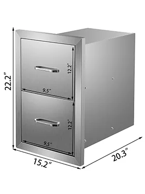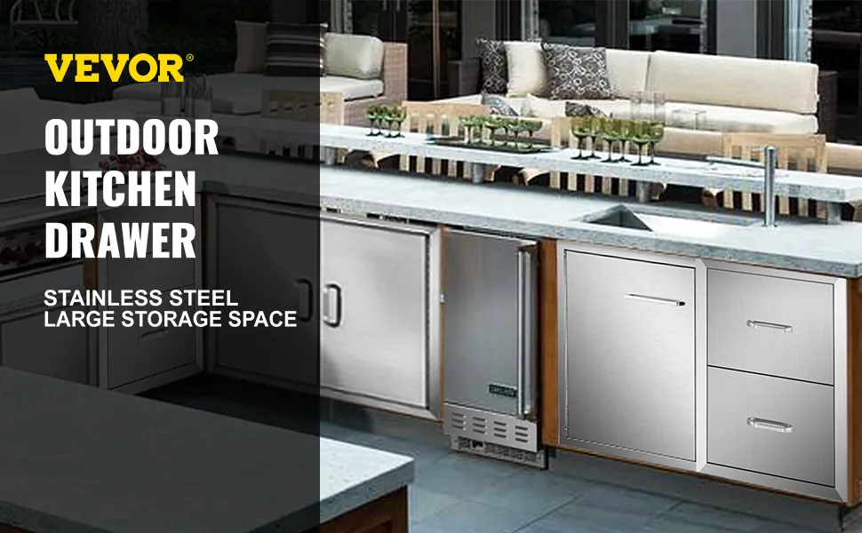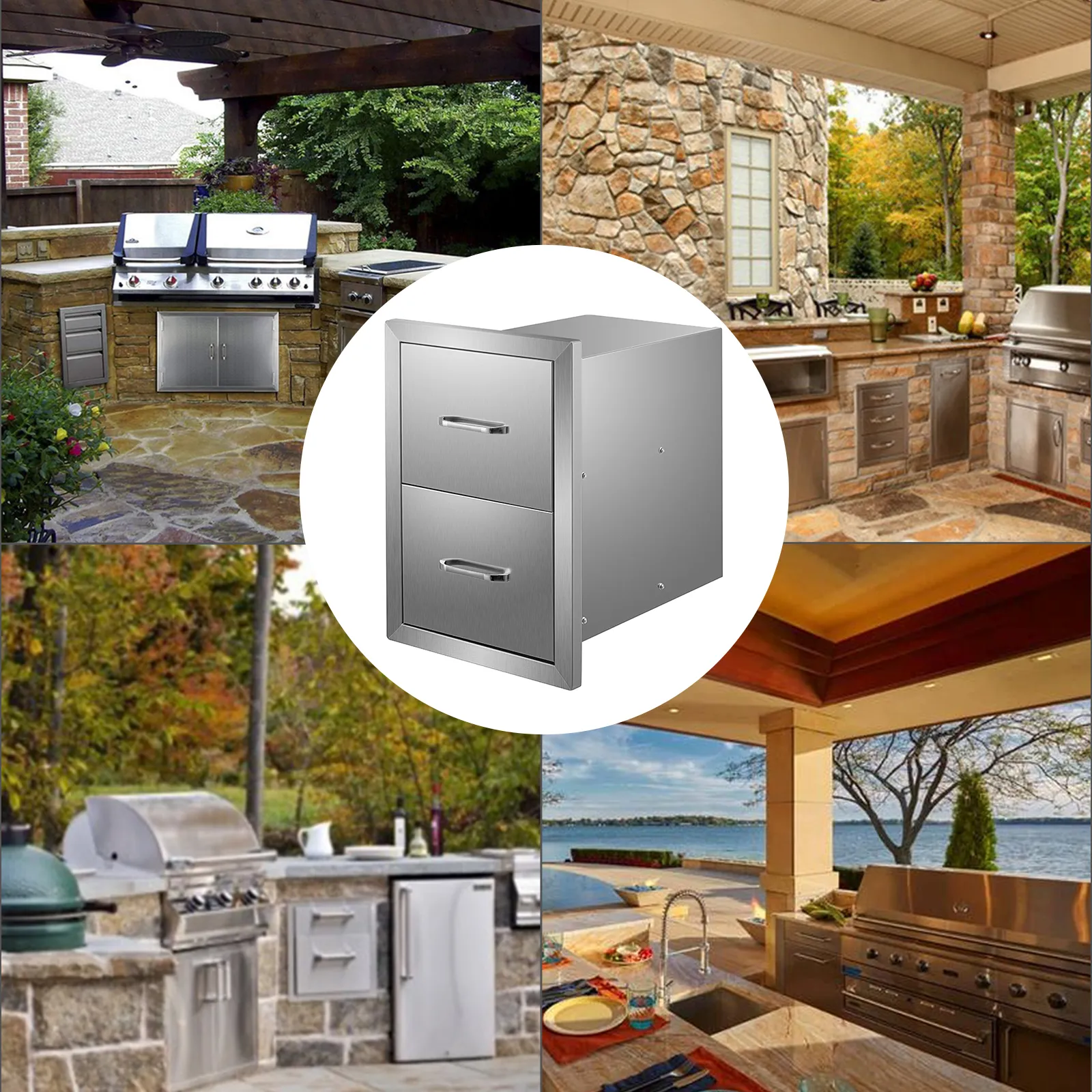 Wir bieten Ihnen die Außenküchenschubladen mit doppeltem Stauraum, die einen großen Speicherplatz für Ihre Küchenutensilien gewährleisten. Es verwendet hochwertigen Edelstahl zugunsten ästhetisches Erscheinungsbilds, Korrosionsschutz und Rostbeständigkeit. Aufgrund der vollständigen Geschlossenheit des Kastenrahmen-Designs kann die Innenseiten unserer Schubladen effektiv vor Regen, Wind, Staub und Insekten geschützt werden. Perfekt für die Außenküche und die Grillinsel.