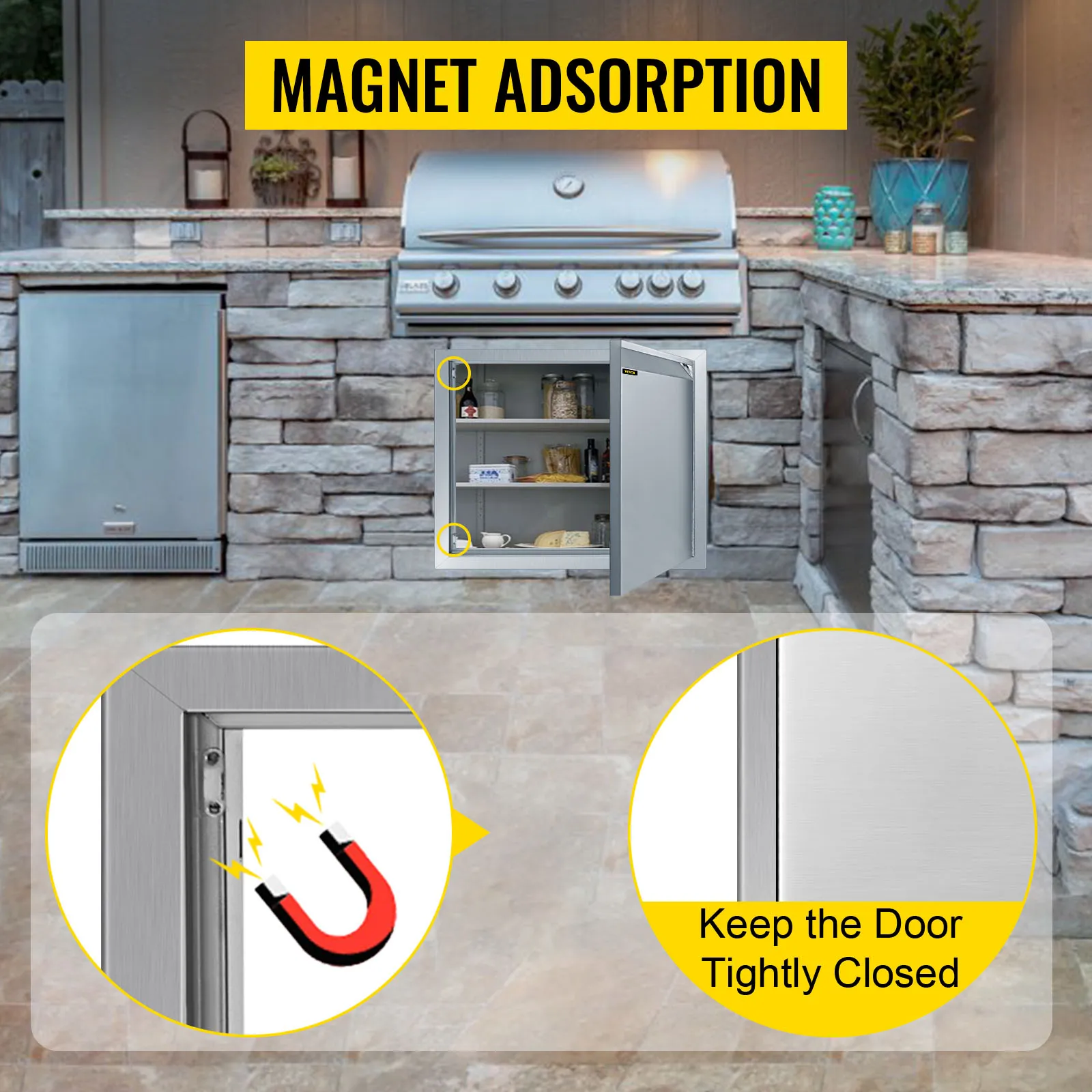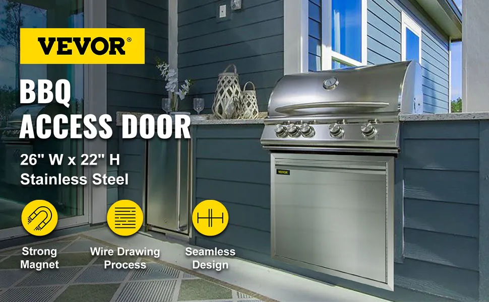 • Die BBQ-Insel-Tür wurde für die Außenküche und die BBQ-Insel entwickelt und ist eine elegante Ergänzung für Ihren Kochbereich. Die Tür aus hochwertigem Edelstahl ist korrosionsbeständig und kratzfest und hält jahrelang allen Witterungseinflüssen stand. Außerdem halten das nahtlose Design und das magnetische Verschlusssystem die Edelstahltür dicht, sodass kein Staub, Regenwasser oder Fliegen eindringen können.