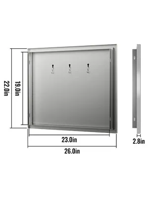 Die Montage dieser BBQ-Tür aus Edelstahl ist dank der vorgebohrten Rahmenlöcher ein Kinderspiel und macht das Bohren überflüssig. Die Abmessungen des Ausschnitts sollten 23 x 19 Zoll / 59 x 49 cm betragen.