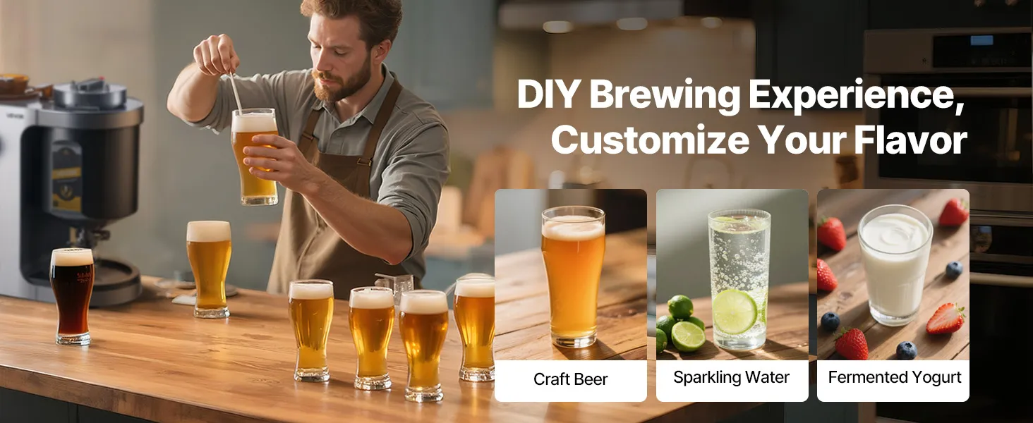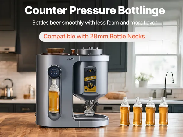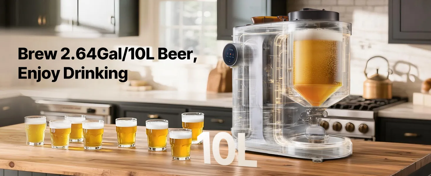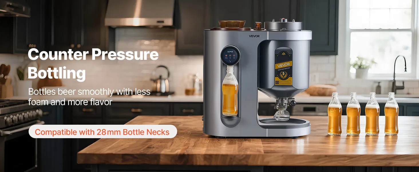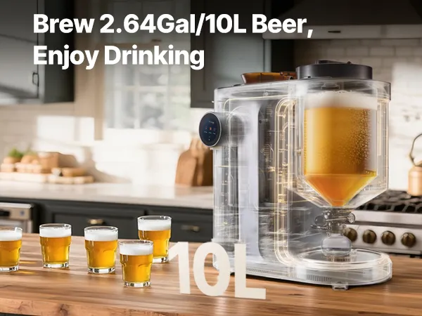 10 Liter pro Brauvorgang: Diese Heimbraumaschine brüht bis zu 2,64 Gallonen (10 L) pro Brauvorgang und ist ideal für den Heimgebrauch oder kleine Treffen. Sie unterstützt die Gegendruckabfüllung für Standardflaschen mit 28 mm Durchmesser, was die Lagerung und das Teilen erleichtert