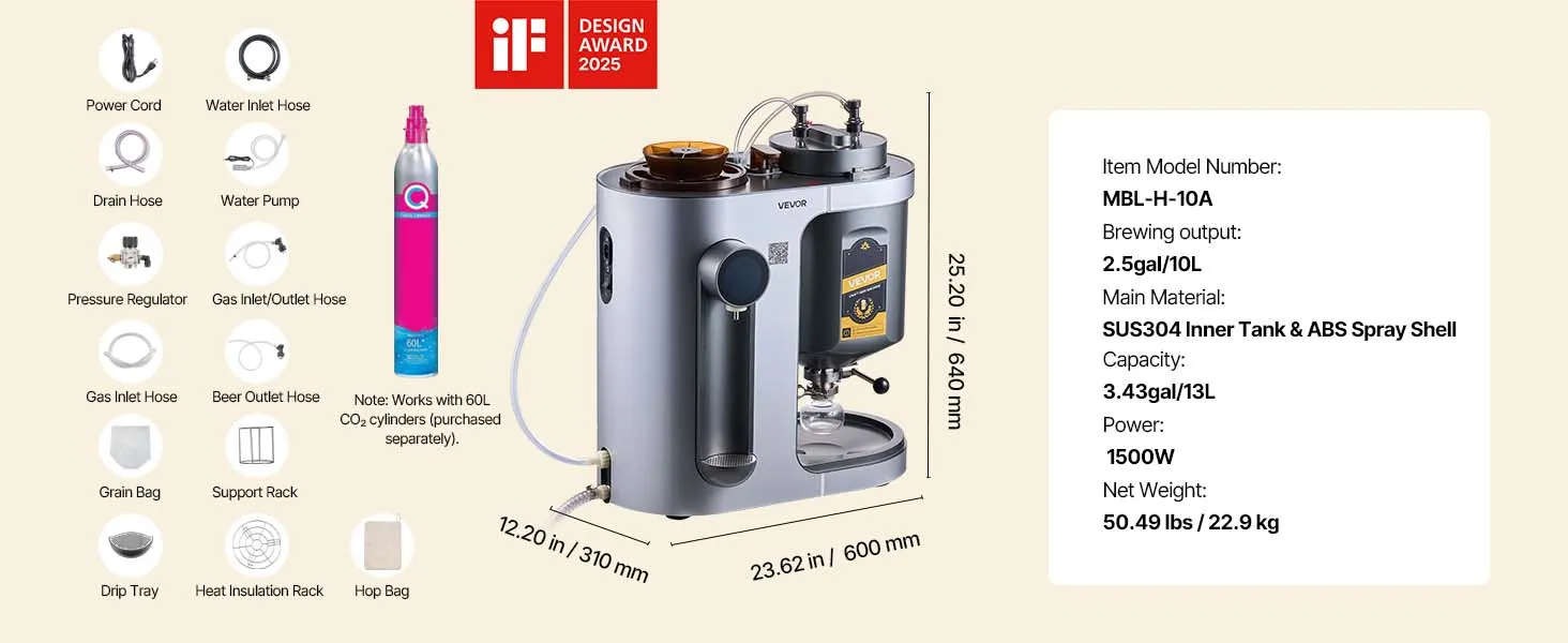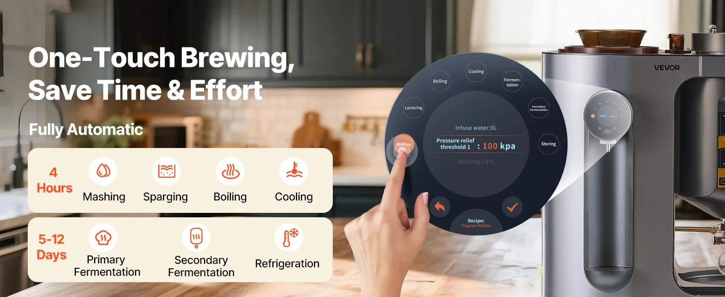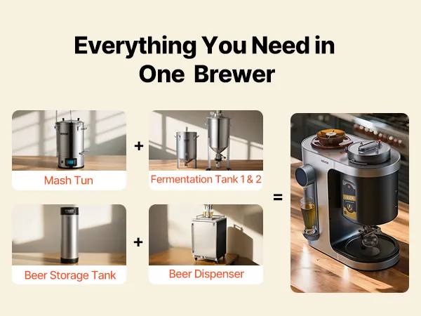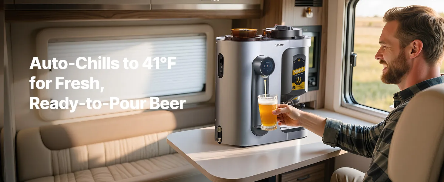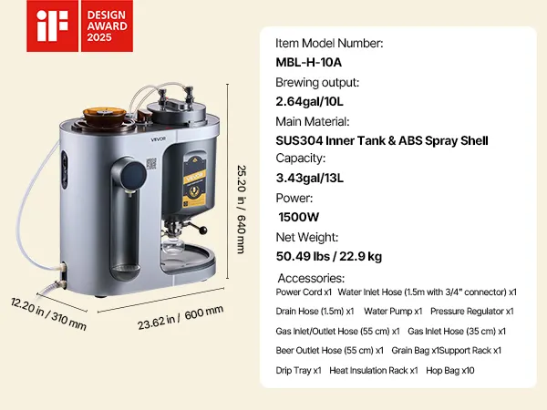 10 Liter pro Brauvorgang: Diese Heimbraumaschine brüht bis zu 2,64 Gallonen (10 L) pro Brauvorgang und ist ideal für den Heimgebrauch oder kleine Treffen. Sie unterstützt die Gegendruckabfüllung für Standardflaschen mit 28 mm Durchmesser, was die Lagerung und das Teilen erleichtert