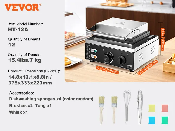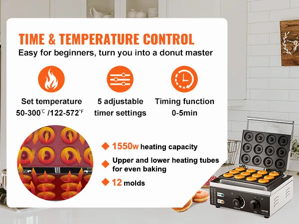 Ausgezeichnete Heizleistung: Diese kommerzielle Donut-Maschine verwendet eine doppelseitige flache Heizform, die ein gleichmäßiges Backen gewährleistet. Sie kann 12 Donuts gleichzeitig herstellen (Durchmesser 2 Zoll / 50 mm, Dicke 0,8 Zoll / 20 mm). Die Antihaft-PTFE-Beschichtung ermöglicht schnelles Backen und einfache Reinigung.