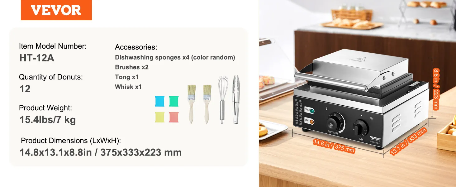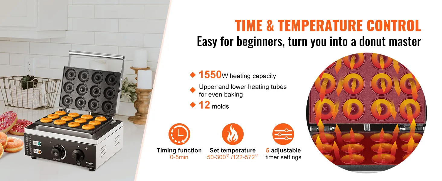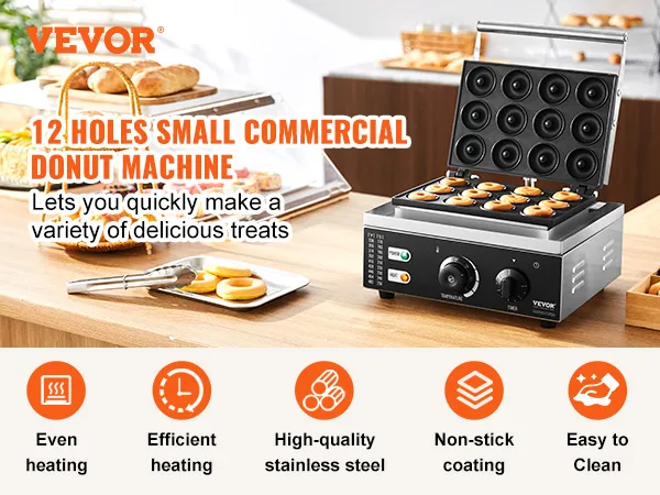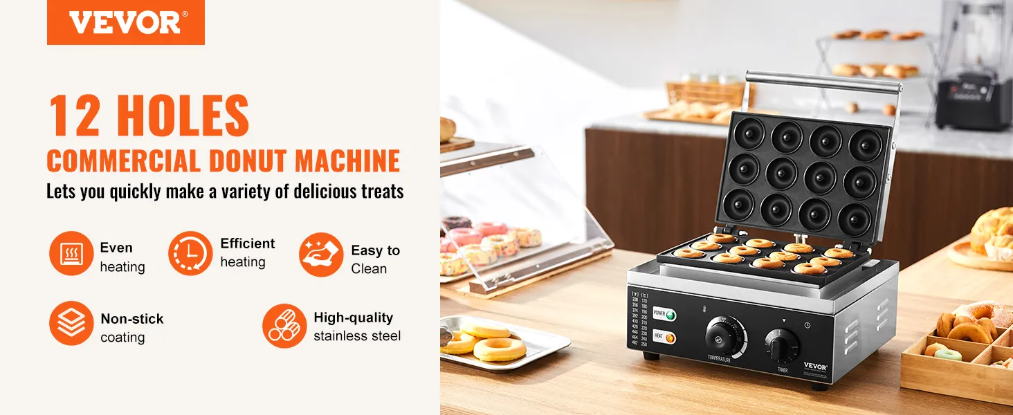 VEVOR Elektrischer Donutmaker, 1550 W Kommerzielle Donutmaschine mit Antihaftbeschichtung, 12-Loch-Waffelmaschine mit Doppelseitiger Heizung für 12 Donuts, für Restaurants und den Heimgebrauch